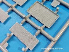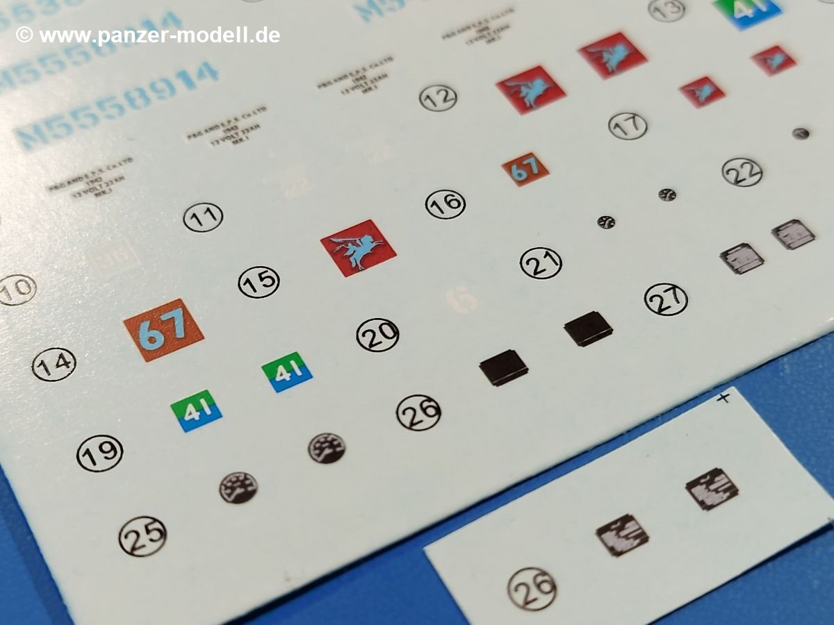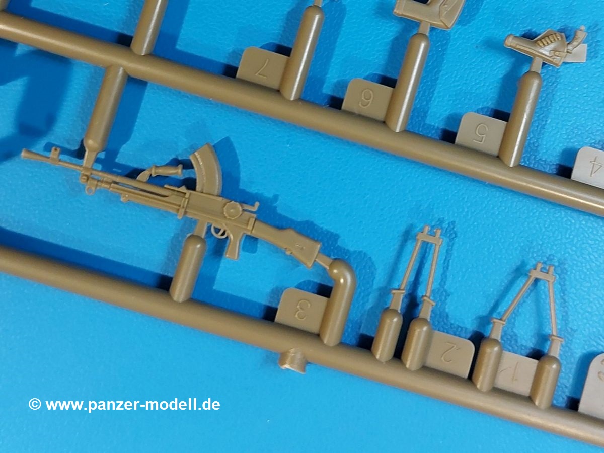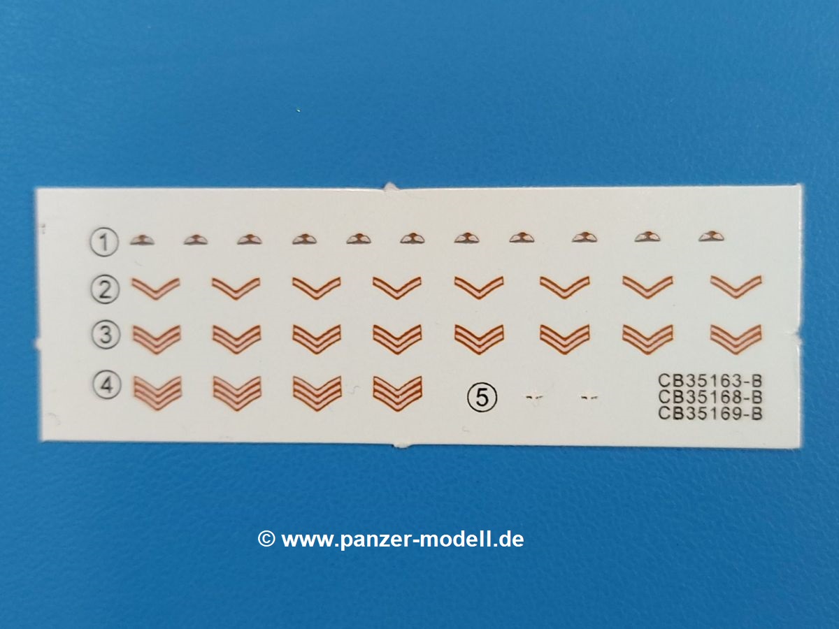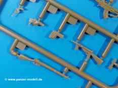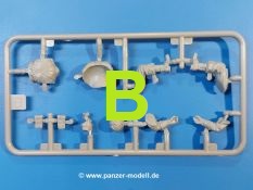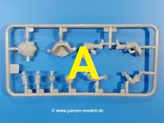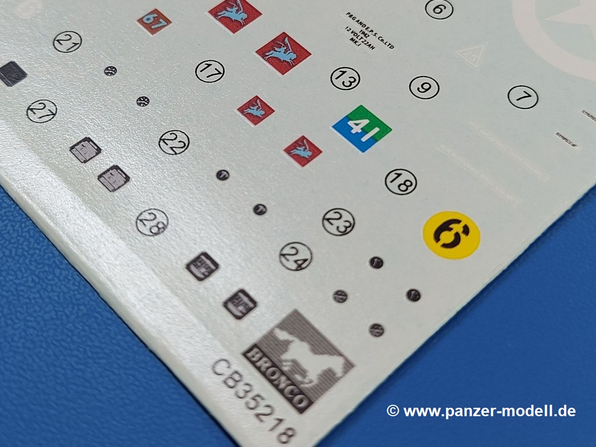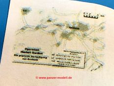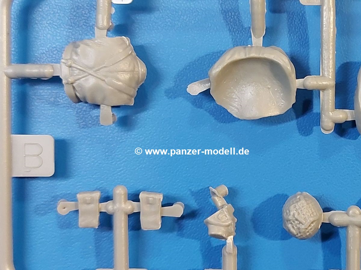 Die Jeeps können mit 5 Figuren besetzt werden 3 Aufklärer, 2 Fernmelder. Jede Figur ist in Arme, Beine, Hüfte, Rumpf und Kopf aufgeteilt. Dazu kommen Helm, Waffen, Magazintaschen und andere Ausrüstung je nach Soldat. Beim Funker kann man entweder den Kopf mit Barrett verwenden oder einen anderen, dem man noch den Stahlhelm aufsetzen muss. Ich bin mir nicht sicher, ob der Funker in seiner Auslegung auf den Rücksitz passt. Das muss der Bau dann zeigen. Der Truppführer der Aufklärer hält eine Karte in der Hand. Die Karte ist beschriftet mit „Operation Market Garden Die geplante Verteidigung von Arnheim“ Bronco Model ich habe Fragen…, obwohl die Beschriftung mit bloßen Augen kaum zu lesen ist! Alle Figuren haben schöne Gesichter. Faltenwurf und Detaillierung der Kleidung und Ausrüstung sind toll. Die Dienstgradabzeichen gibt es als Decals dazu. Es gibt Markierungen für 3 Fahrzeuge, aber ohne Angaben von Einheiten. Diese müsste man anhand der Markierungen selbst erforschen, aber Uniformen und „die Karte“ implizieren, dass es sich um Fahrzeuge während der Operation Market Garden im September 1944 handelt.
