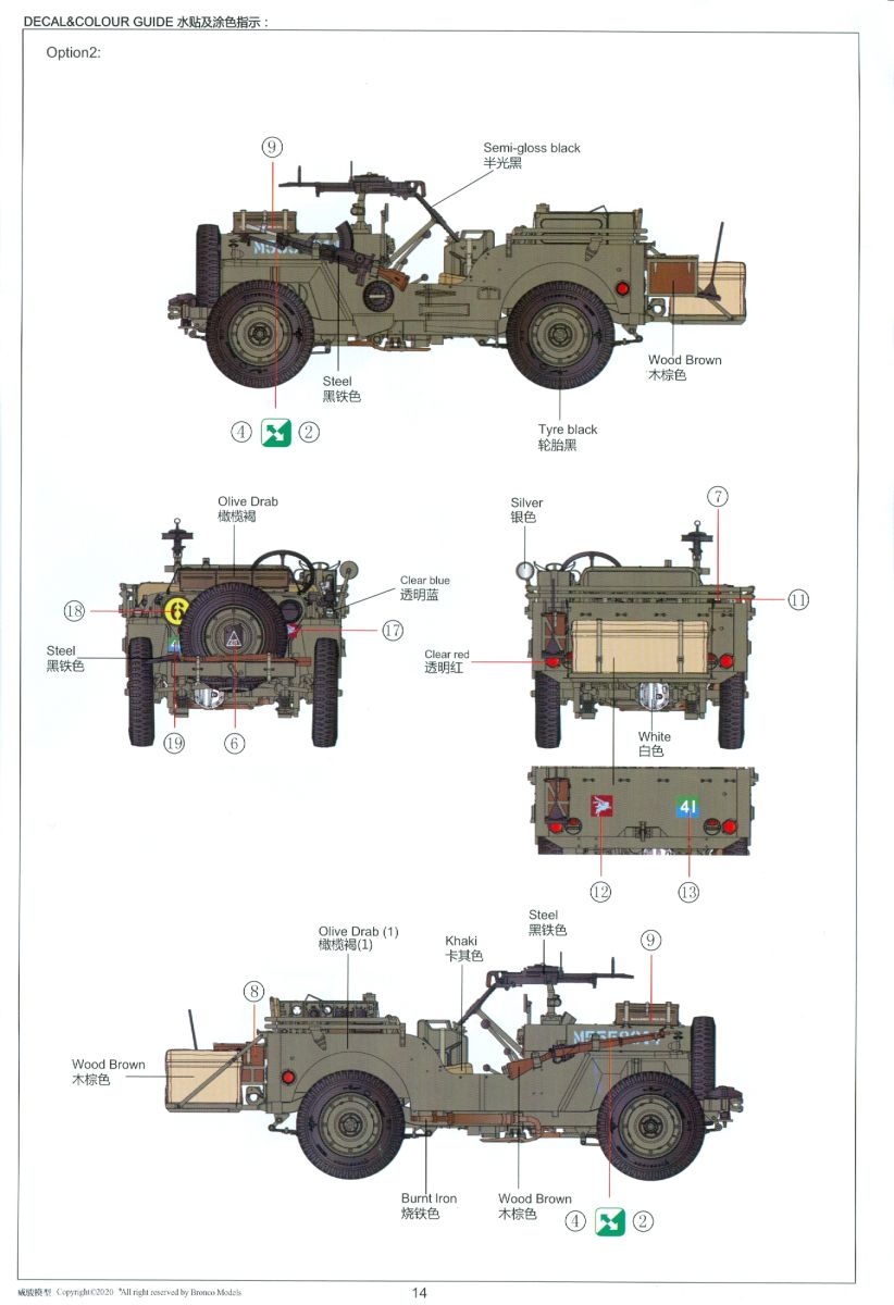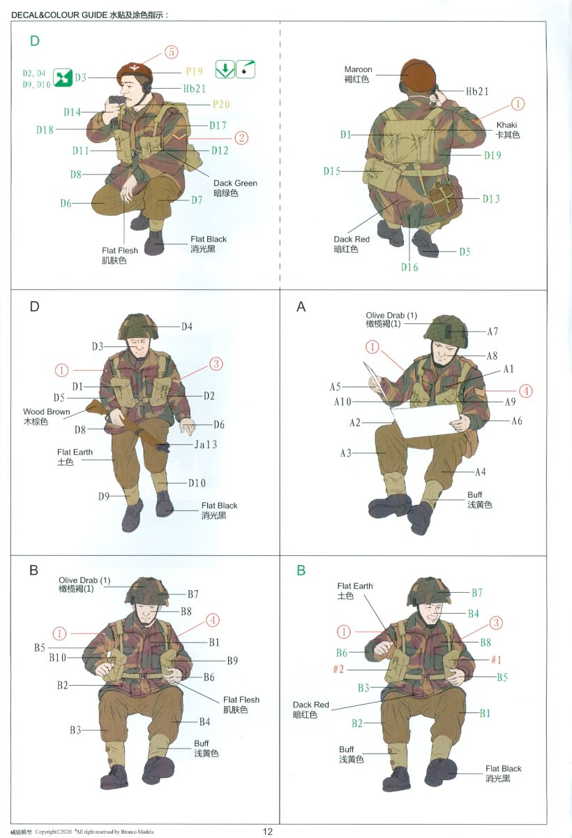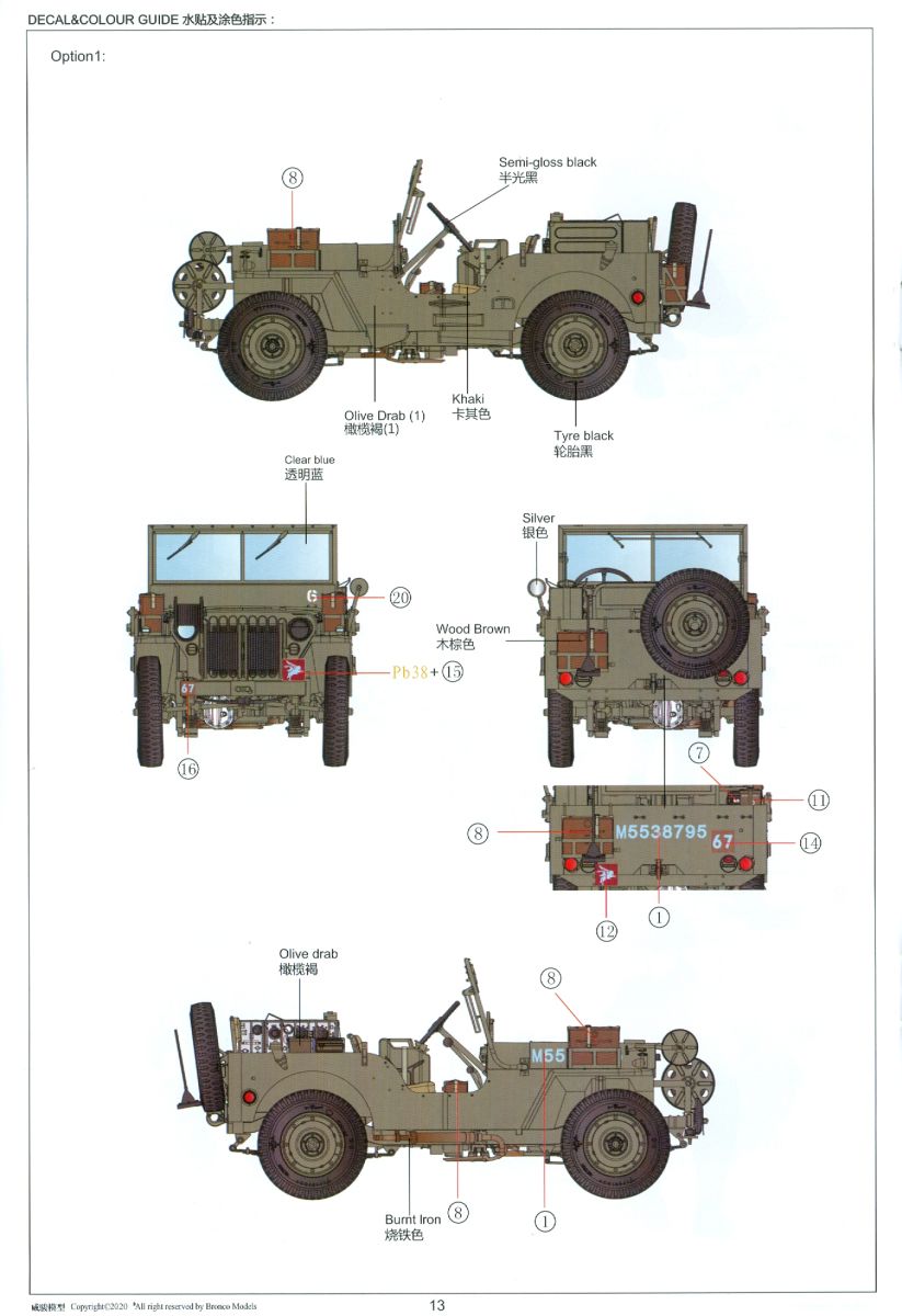 Die teils farbige Bauanleitung erklärt den Zusammenbau beider Fahrzeuge in 44 Schritten. Auf dem Deckblatt erscheint in Englisch und Chinesisch ein kurzer Abriss der Geschichte des Jeeps in britischem Einsatz. Farbangaben bei Verwendung von Mr. Hobby, Hobby Color, Humbrol und Tamiya Farben finden sich auf Seite 2. Die letzten 4 Seiten zeigen die Lackierung von Figuren und Fahrzeugen und Anbringung der Decals. Eine schöne Erweiterung der britischen Jeeps von Bronco. Man kann sie sich auch gut zusammen mit einem Horsa Segler vorstellen. Bronco typisch viele Kleinteile in Plastik und PE werden den ganzen Modellbauer fordern. Im deutschen Handel wird das Set wohl um die 48 - 55,- EUR kosten.