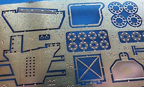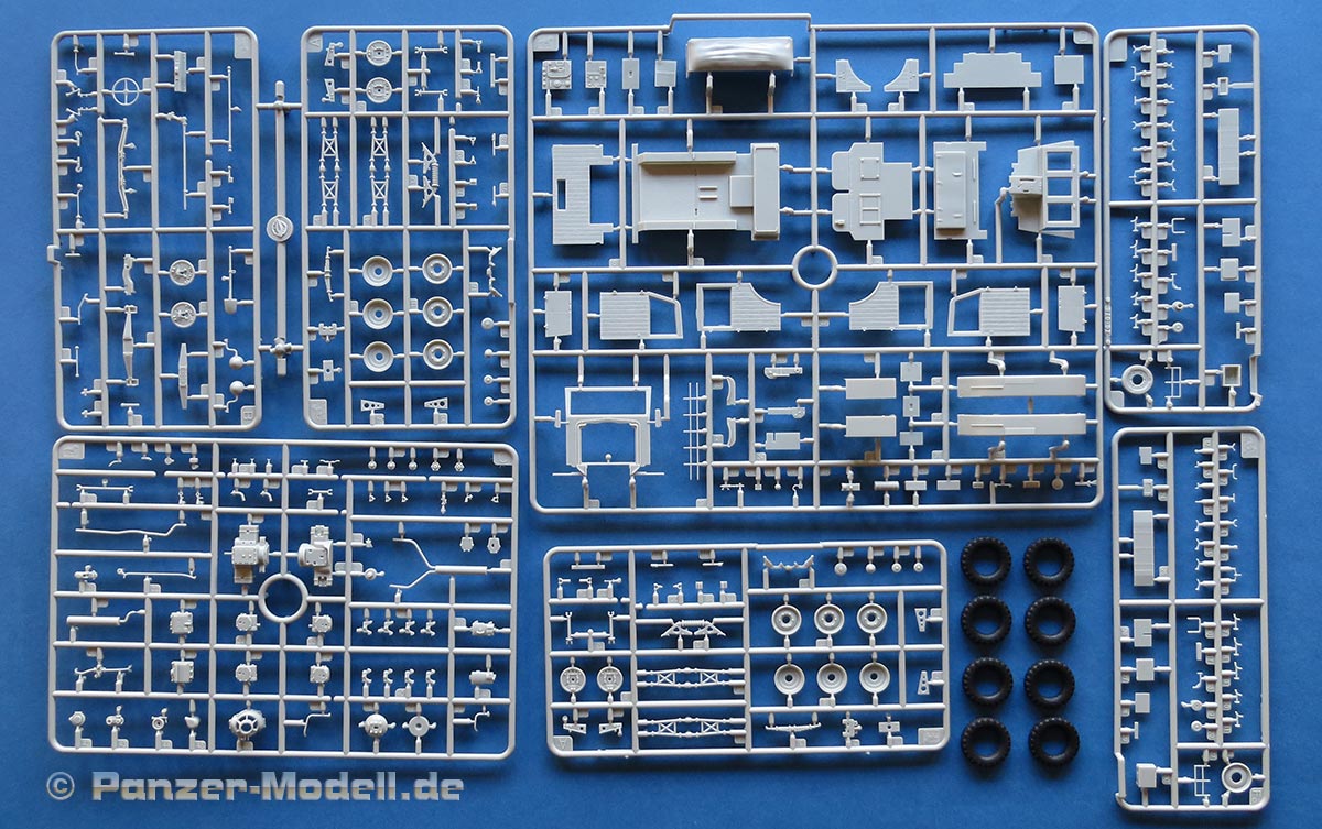 Im Karton finden wir 7 graue Spritzlinge, 2 durchsichtige Spritzlinge, 8 Vinylreifen, eine PE Platine, Seilmaterial und ein Decalbogen.
