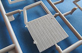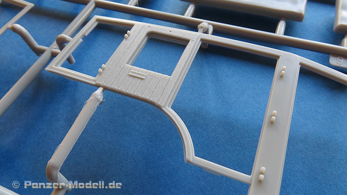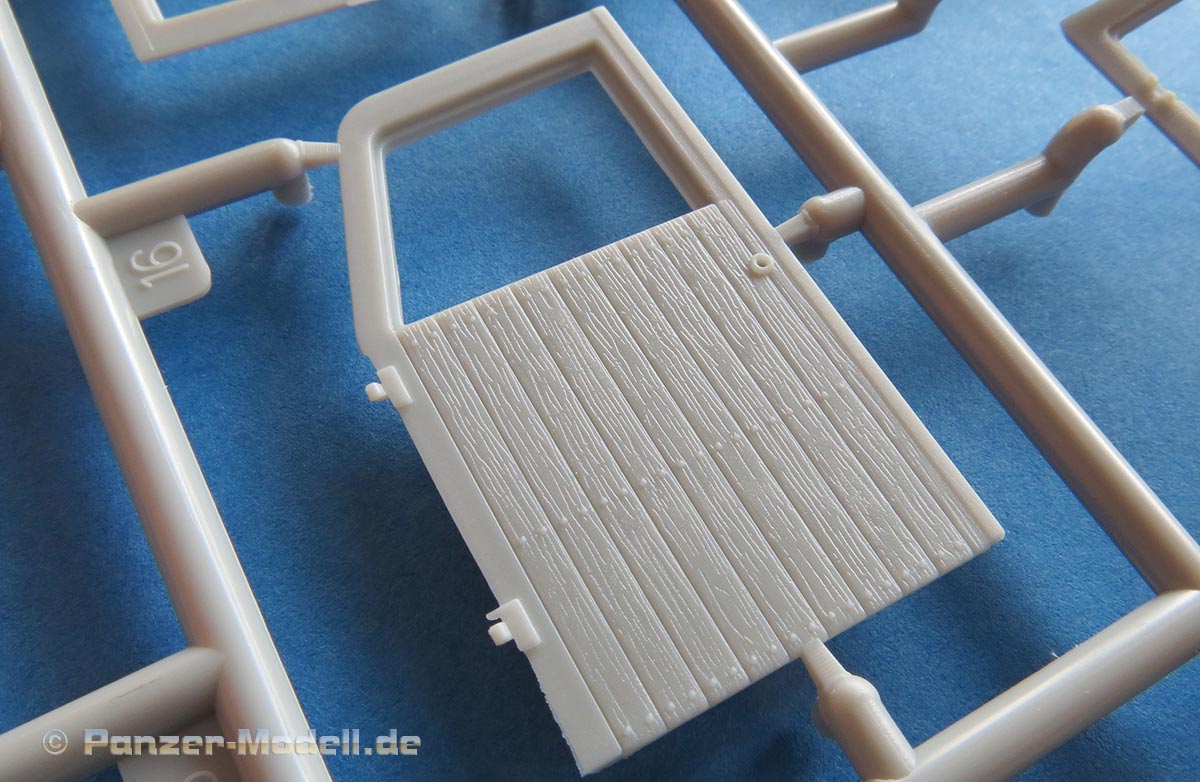 Der Heckaufbau setzt sich aus mehreren Teilen zusammen, wobei die Seitenwände auch den Fahrerraum mit winschließen. Hier sind die Strukturen der Holzbretter sehr schön wiedergegegeben. Die Türausschnitte sind offen gegossen und die Türen liegen einzeln bei, sodass man diese sowohl offen als auch geschlossen bauen kann. Auch die Türen sind mit schönesn Strukturen vesehen und werden zusätzlich innen wie aussen mit weiteren Teilen verfeinert, insbesondere mt feinen PE Teilen für die Griffe.