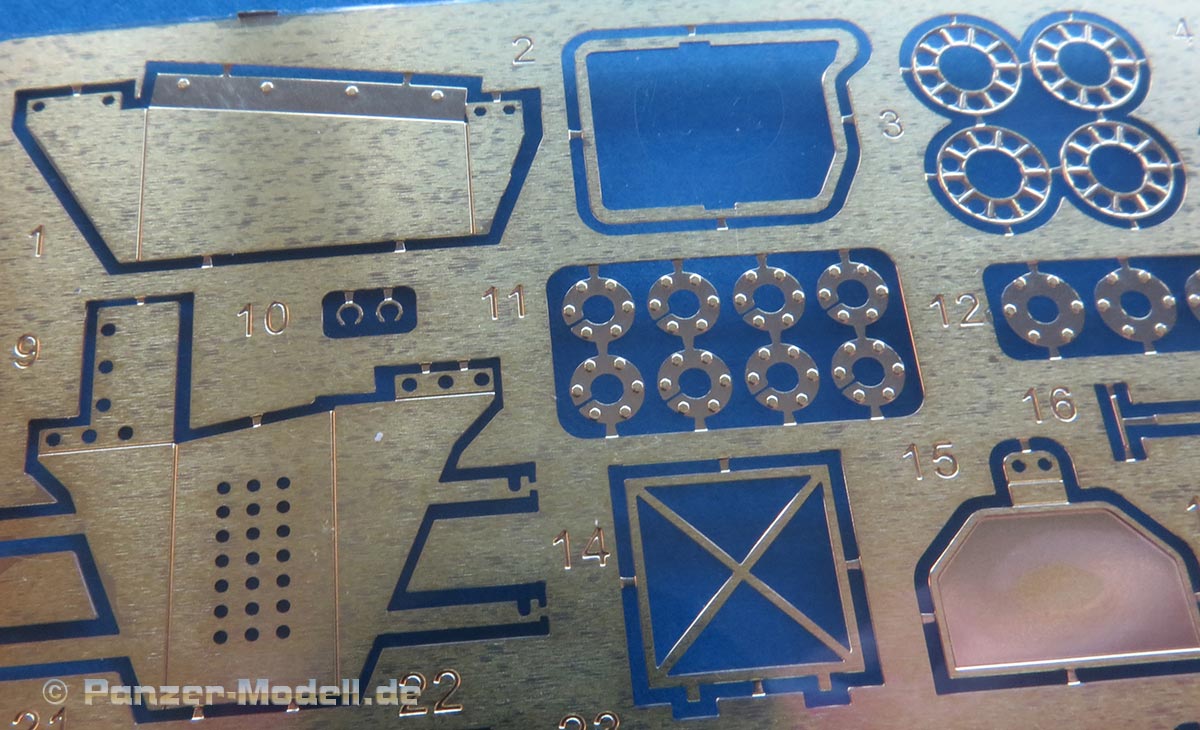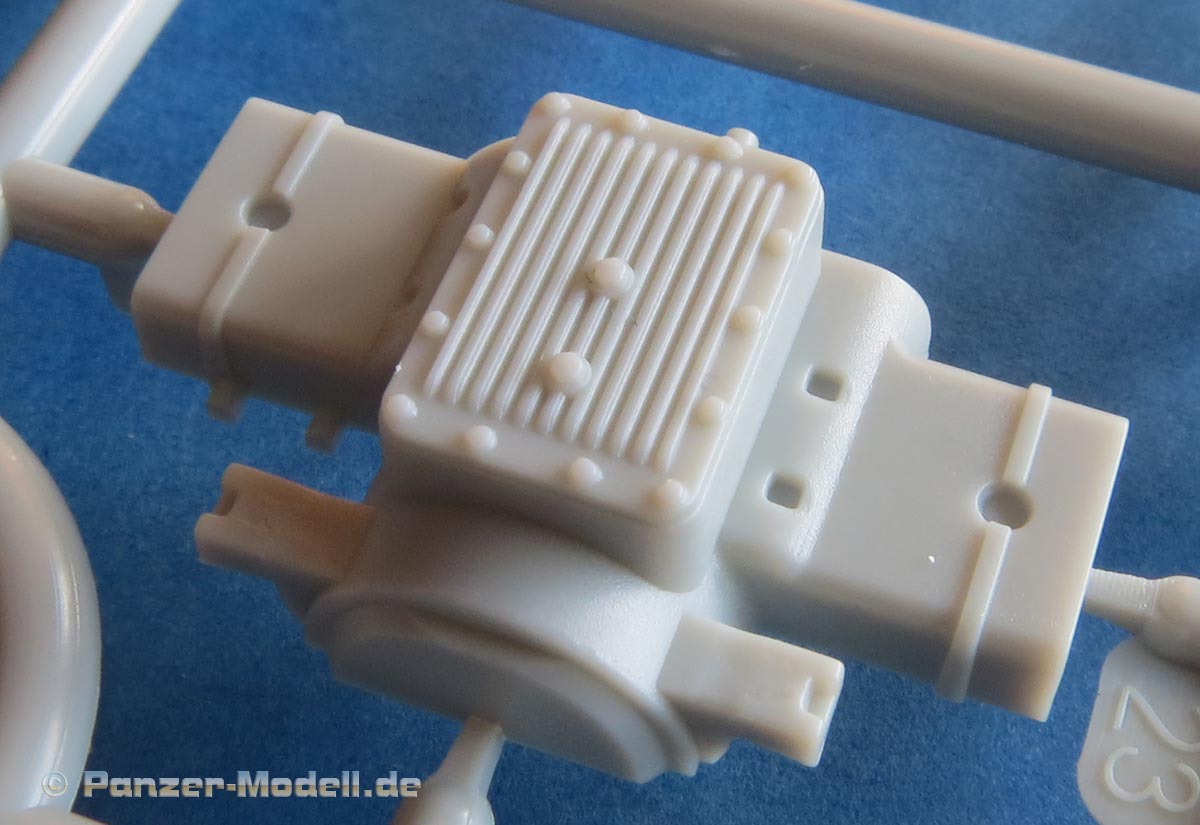Der Aufbau der Protze ist mit Motorhaube, Kühlergrill, Kotflügeln, detaillierte Fahrerkabine mit Armaturen, Windschutzscheibe und wunderschönen Sitzpolstern mit Faltenstruktur sehr schön und detailliert widergegeben. Viele von den Teilen werden durch weitere, kleine, und sehr filigrane PE Teile ergänzt und verfeinert. .