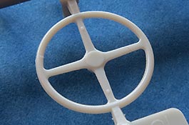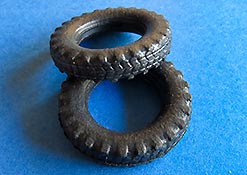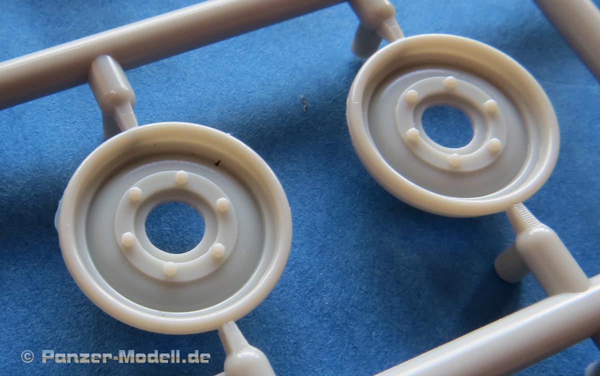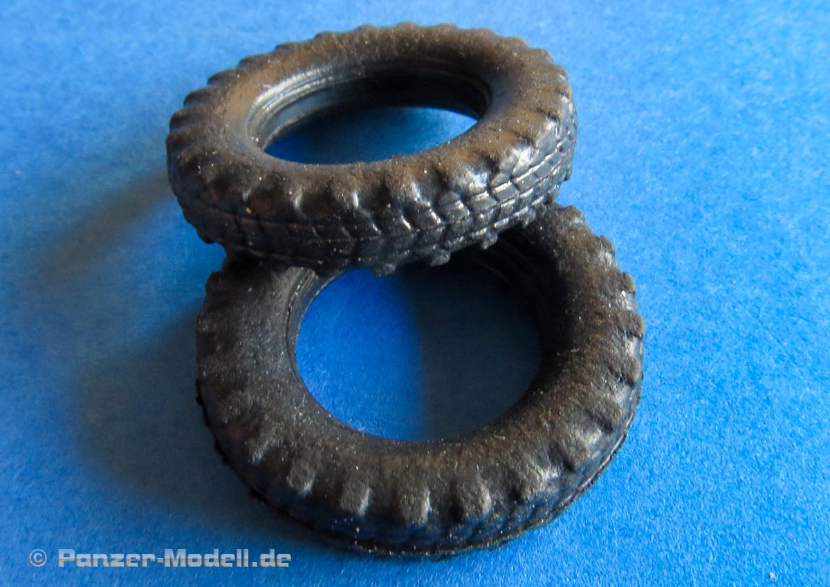 Die Plastikfelgen werden von beiden Seiten in die Reifenteile eingefügt und verklebt. Auch diese machen einen ausgezeichneten Eindruck mit feinen Details.