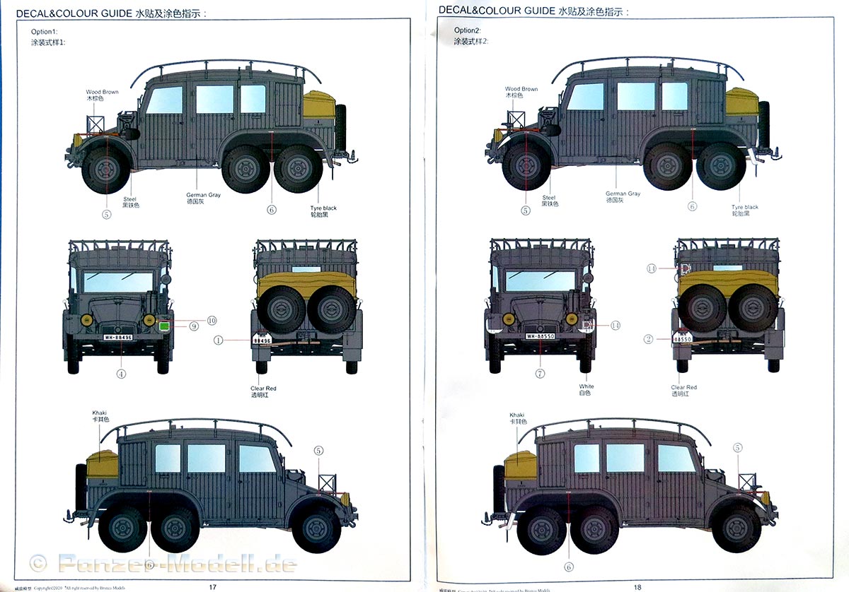 Auf der letzten Seiten finden sich 3 farbig gedruckte Farbprofile für die Bemalung und Markierung des Fahrzeugs mit 3 Optionen: