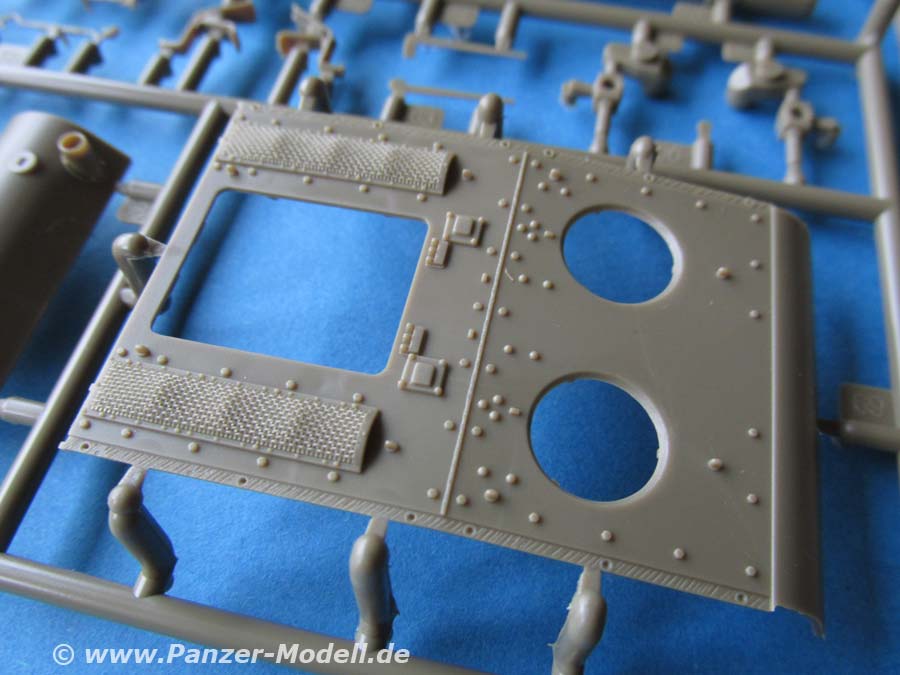 Selbst so feine Details, die oft sogar im 1:35er Modellbau unterschlagen werden, wie Gussstruktur und schweißnähte sind hier passend dargestellt. Der Aufbau zeigt hier übrigens die gleiche Struktur wie beim 1:35er Modell, die mir persönlich eher nach Geschossbeschädigungen als Gussstruktur aussieht. Die Kanonenblende hingegen besitzt eine sehr feine raue Oberfläche und sogar eine Gussnummer.