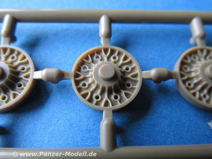 Die Unterwanne kommt in einem Stück daher und weist schöne aufgeprägte Details auf. Die Schwingarme werden einzeln angeklebt und können somit ggf. einem unebenen unterhrund angepasst werden. In dem Fall allerdings müsst eman sich um neue Ketten kümmern, denn die beiliegenden sind Segmentketten, d.h. der obere und untere Kettenlauf sind bereits in einem Stück dargestellt. Die Detaillierung der Kette kann sich aber echt sehen lassen. Und beim oberen Kettenlauf hat man auch schon gleich den richtigen Kettendurchang mit einmodelliert. Das sieht wirklich gut und stimmig aus.