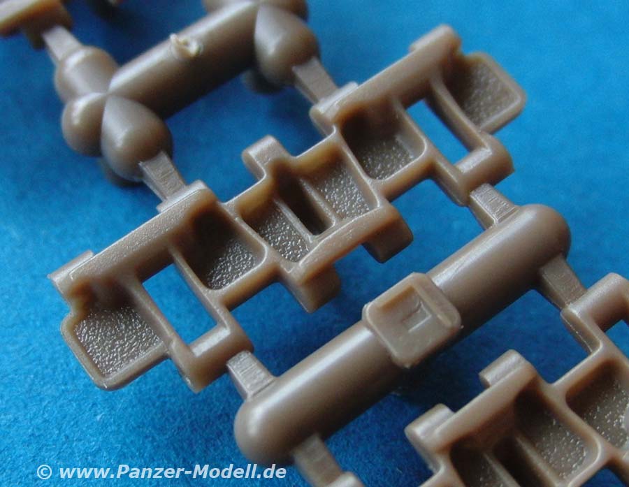 Der Bausatz besteht aus 13 Spritzrahmen mit den Kettenbolzen, 20 Spritzsträngen mit den 240 Einzelkettengliedern und eine Zusammenbauhilfe. Auf dieser werden bis zu 8 Kettenglieder aufgelegt und dann mit jeweils 2 Kettenbolzen zusammengesteckt. Damit bleibt die Kette beweglich.