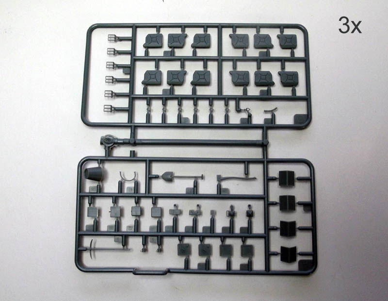 Eine feines Zubehörset für britische Fahrzeugmodelle oder Figuren in 1:35 ist von Bronco mit der Art. Nr. AB3562 im Handel erschienen. Der Bausatz enthält 12 Spritzgussrahmen, jeweils die Rahmen A, B, C und D... und zwar jeweils 3x. Dazu kommt noch ein kleines Set mit Photoätzteilen und ein Decalsheet. Enthalten sind Metallkanister für Wasser, Kraftstoff und Öl. Darüber hinaus finden sich Eimer, Spaten, Äxte, Spitzhacken und vieles mehr. Munitionsbehälter fehlen natürlich auch nicht. Als besonderer Gag liegen auch mehrere Kaffeebecher bei. Ach, halt, wir sind ja bei den Briten. Daher sind es wohl eher Teebecher. Als Bau- und Bemalungsanleitung dient die Rückseite der Verpackung Besonders begeistert bin ich von den feinen Details der Bauteile. Egal ob man nun mit diesem Set ein Fahrzeug ausrüsten möchte, mit etwas Zubehör mehr Leben in ein Diorama bringen möchte oder ein paar Figuren in Szene setzen will, mit diesem Set ist man auf jeden Fall gut bedient. Insgesamt gesehen bekommt man hier für ca. 16,- EUR ein tolles Zubehörset. Prädikat: Sehr empfehlenswert.