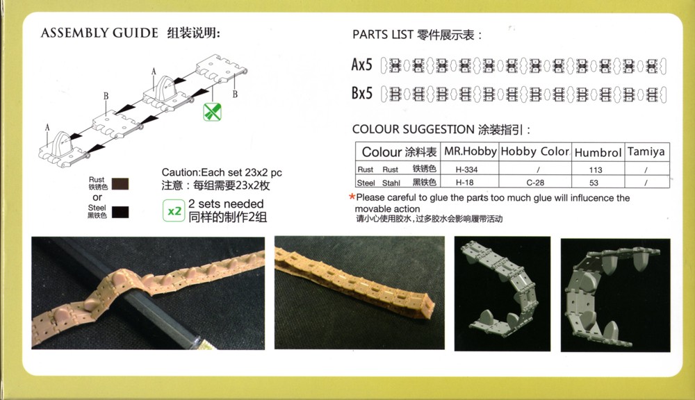 Die Kette geht in dem vergleichsweise großen Karton fast unter. Im Karton steckt noch ein kleinerer Karton, in dem dann 5 sandbraune Spritzlinge A und 5 B enthalten sind. Die 1-seitige Bau- und Bemalungsanleitung mit Fotos und CAD Zeichnungen finden wir auf der Rückseite des Kartons.