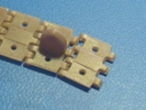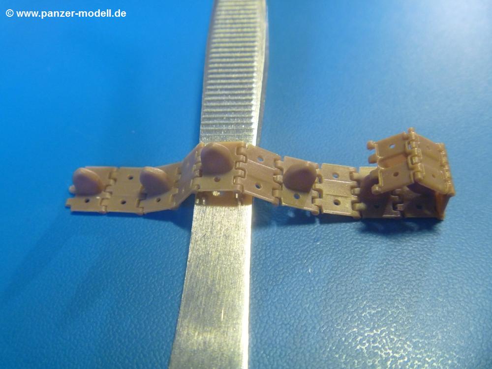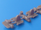 Die Originalkette hat ja nicht viele Details zu bieten, aber diese sind alle da. Dünne Platten, durchbrochene Löcher und innen hohle Mitteführungszähne. Es gibt keine Kettenbolzen. Dies hat Bronco mittels Löchern und kurzen angegossenen Bolzen gelöst.