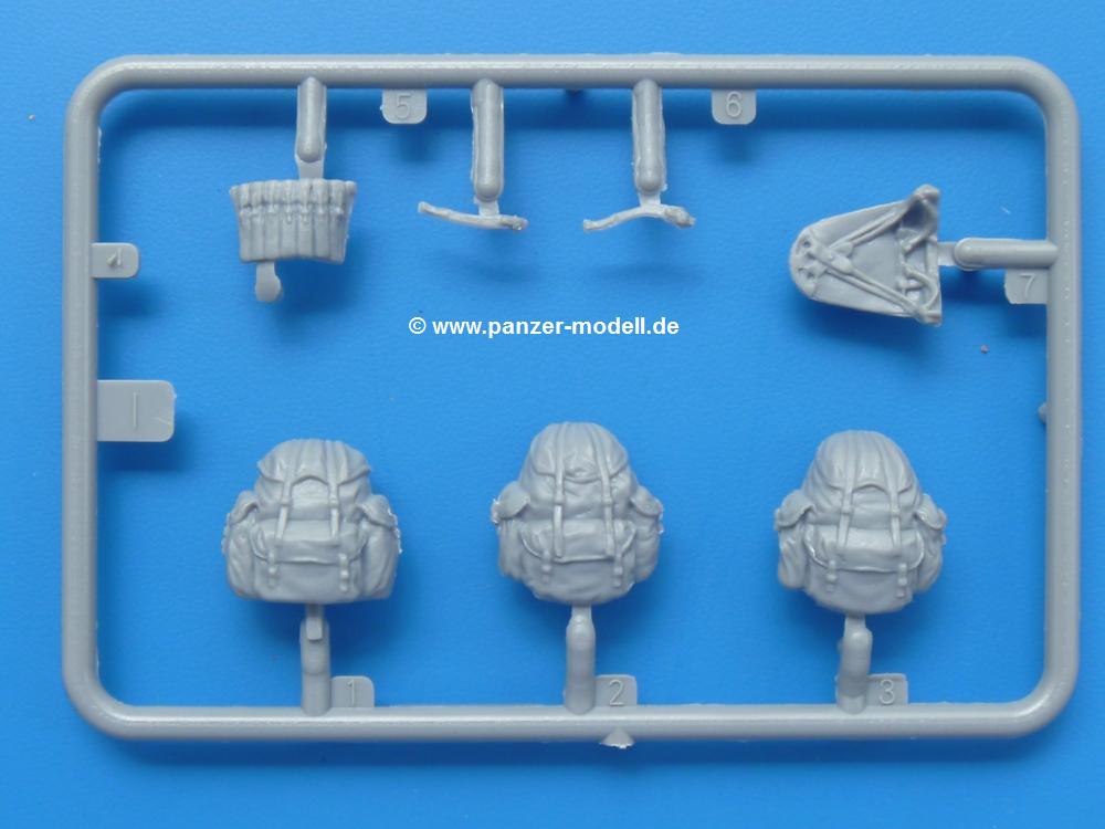 Sehr schön auch die Rucksäcke. Diese sind hinten hohl, aber für je einen ist die Rückseite mit den Trageschlaufen dabei. Am Spritzling der Rucksäcke sind auch nach Magazintaschen dabei, die in der Anleitung keine Erwähnung finden. Die nimmt man gern aber noch mit.