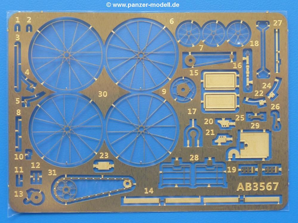 - Ätzteilplatine P (1x): Felgen für Welbike- und Fahrradräder, Ritzel und Kette für Fahrrad, Käfigtüren für den Brieftaubenbehälter, Teile für PIAT