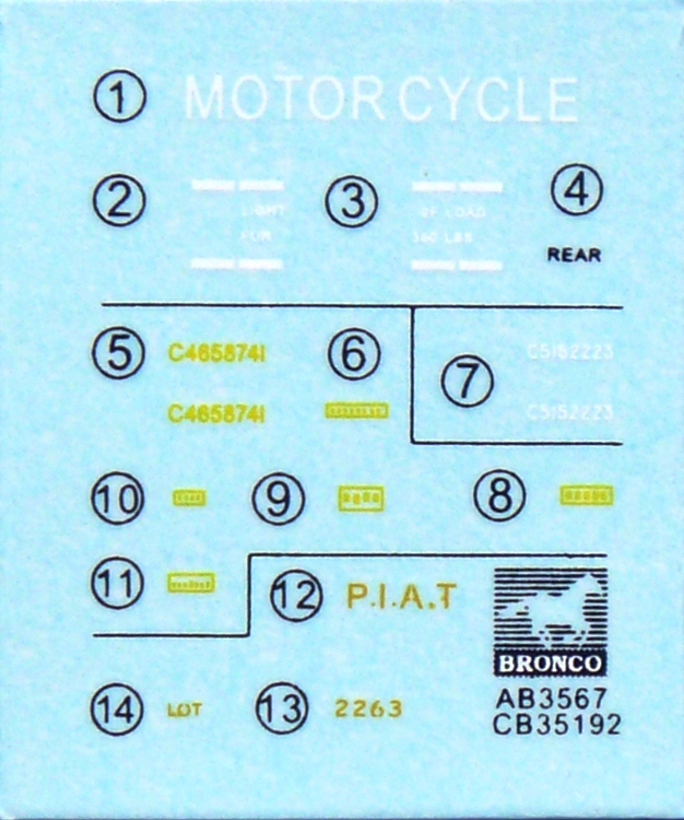 - Decalbogen (1x): Beschriftungen für Welbike, Transportbehälter und Munitionsbehälter (PIAT)