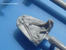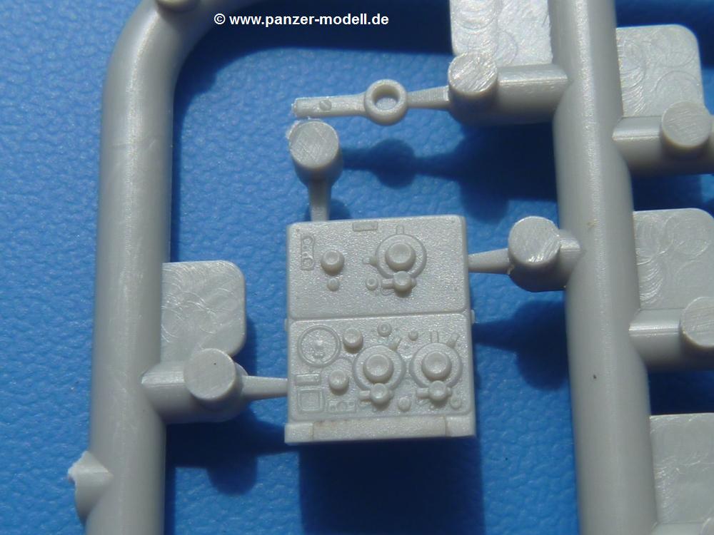 Kein einfacher Plastikklotz, sondern alle Seitenwände einzeln mit tollen Details. Das Gerät kann man geschlossen zum Transport oder geöffnet zur Benutzung bauen. Bei den feinen Instrumenten fällt einem der Bau der offenen Version leicht. Geöffnet hat dass Funkgerät einen Stoffrahmen, der wohl Witterungseinflüsse fernhalten soll. Die Trageeinrichtung wird mit Ätzteilen dargestellt. Kopfhörer (Ätzteilalarm) und Mikrofon gehören auch dazu. Einzig das Verbindungskabel zwischen Ober- und Unterteil fehlt.