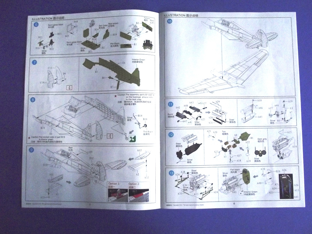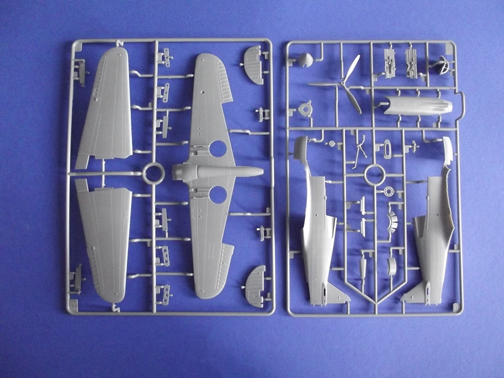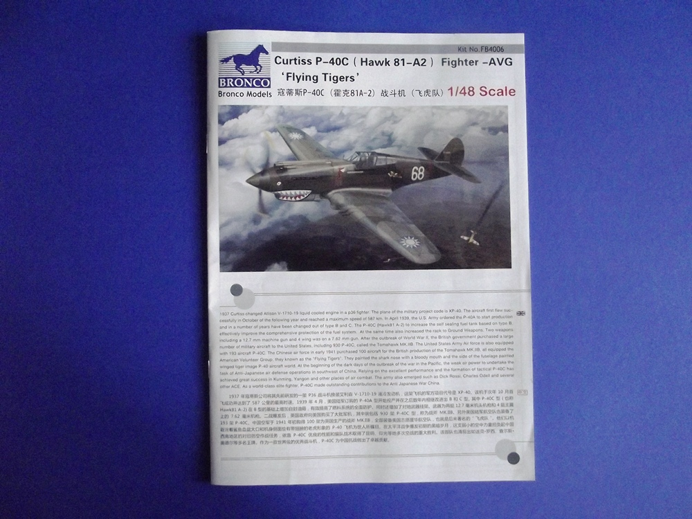 Der Bausatz besteht aus vier Spritzrahmen in hellgrauem Plastik, einem Spritzrahmen mit Klarsichtteilen für die Kanzel, einer kleinen Platine mit PE-Teilen und einem sehr umfangreichen Decalsheet. Der Bausatz lässt den Bau / die Markierung von sechs verschiedenen Varianten zu und bietet auch viele Optionen. Das Fahrwerk kann aus- oder eingefahren montiert werden, die Triebwerkabdeckung kann offen oder geschlossen dargestellt werden, es liegen verschiedene Bord-MG bei die wahlweise / optional montiert werden können, die Kanzel kann offen, geschlossen und dazu noch beweglich gestaltet werden. Die Bauanleitung gliedert sich in insgesamt 19 Baustufen. Die Zeichnungen wirken übersichtlich und eindeutig. Innerhalb der einzelnen Stufen finden sich Hinweise für die Detailbemalung einzelner Bauteile oder Baugruppen. Die Bemalungsanleitung zeigt die sechs möglichen Varianten aus den Jahren 1941 und 1942 jeweils in einer farbigen Vier-Seiten-Ansicht. Die Unterschiede liegen hier aber nur in den Markierungen, der Tarnanstrich ist bei allen gezeigten Flugzeugen gleich. Die Fertigungsqualität liegt, wie bei Bronco üblich, auf sehr hohem Niveau. Feinste Oberflächendetails und absolut sauber und scharfkantig ausgeführte Bauteile versprechen reichlich Bastelvergnügen. Einzelne Baugruppen bestehen auch nicht, wie man das sonst von Bronco kennt, aus etlichen Einzelteilen. Die Zahl der Bauteile für die Komplettierung einer Baugruppe hält sich in Grenzen, lediglich dem Triebwerk widmet die Bauanleitung immerhin vier Baustufen. Aber dafür erhält man am Ende auch einen echten Hingucker! Der absolute Knüller in diesem Bausatz ist jedoch ein beiliegender Aufnäher, im Format von annähernd DIN A4, wie ihn die Angehörigen der `Flying Tigers` auf dem Rücken ihrer Einsatzkleidung getragen haben. Dass es sich hierbei nicht um einen Originalaufnäher sondern um ein, auf „alt“ getrimmtes Replikat handelt brauche ich wohl nicht zu erwähnen. Und da kommt einem doch auch gleich die Idee wie man das fertige Modell optisch ansprechend in der Vitrine präsentieren könnte… Ein schöner Bilderrahmen mit eingelegtem Aufnäher und darauf steht dann das Flugzeug. Dürfte mit Sicherheit sehr gut aussehen. Zwei dieser Aufnäher finden sich auch auf dem Decalsheet wieder (Decal Nr. 80). Mit diesen Decals könnte man Pilotenfiguren dekorieren. Leider liegen dem Bausatz keine Figuren bei. Insgesamt gesehen ein toller Bausatz mit schönen Details und netten Features. Kein Modell für den blutigen Anfänger. Etwas Modellbauerfahrung muss schon vorhanden sein. Der Kaufpreis in Deutschland liegt bei ca. 43,- EUR. Zunächst wirkt das für so ein kleines Modell in 1:48 recht heftig, aber der Bausatzinhalt rechtfertigt den Preis.