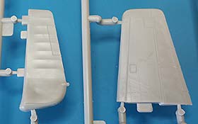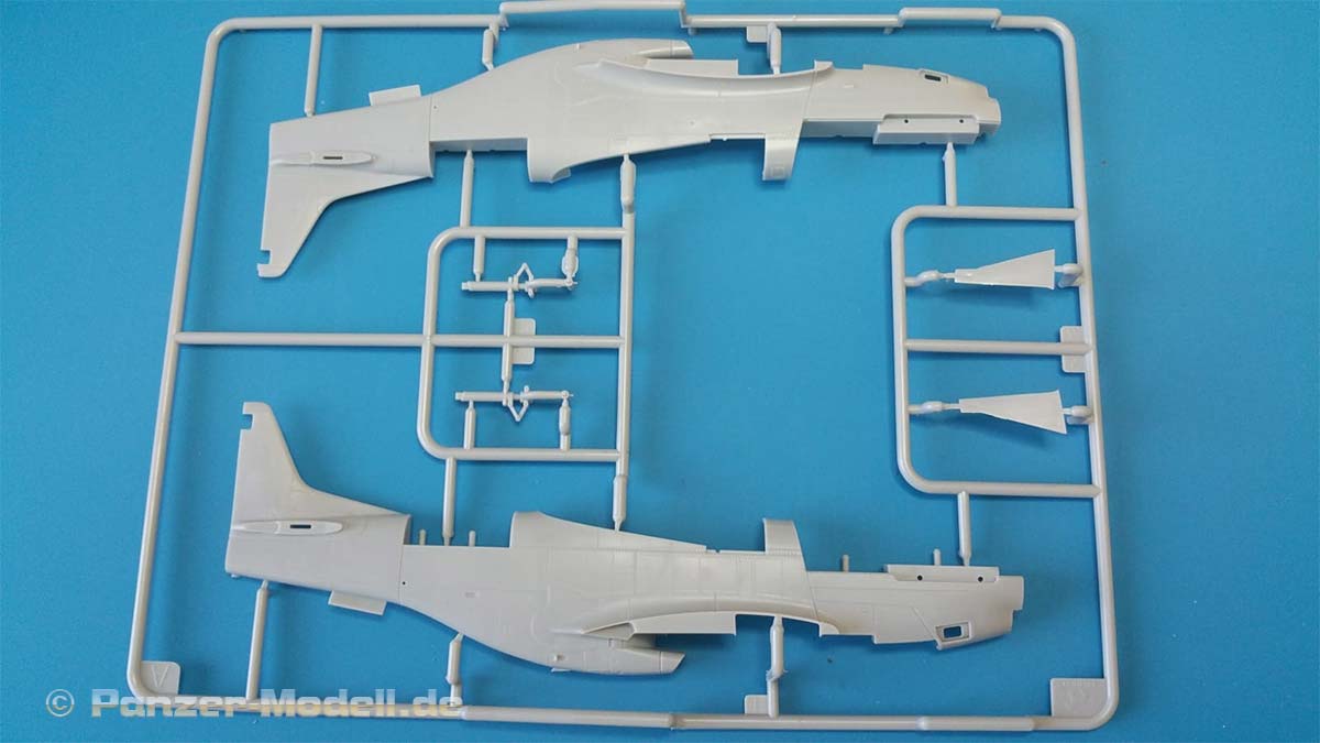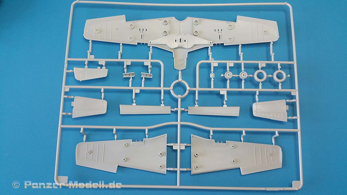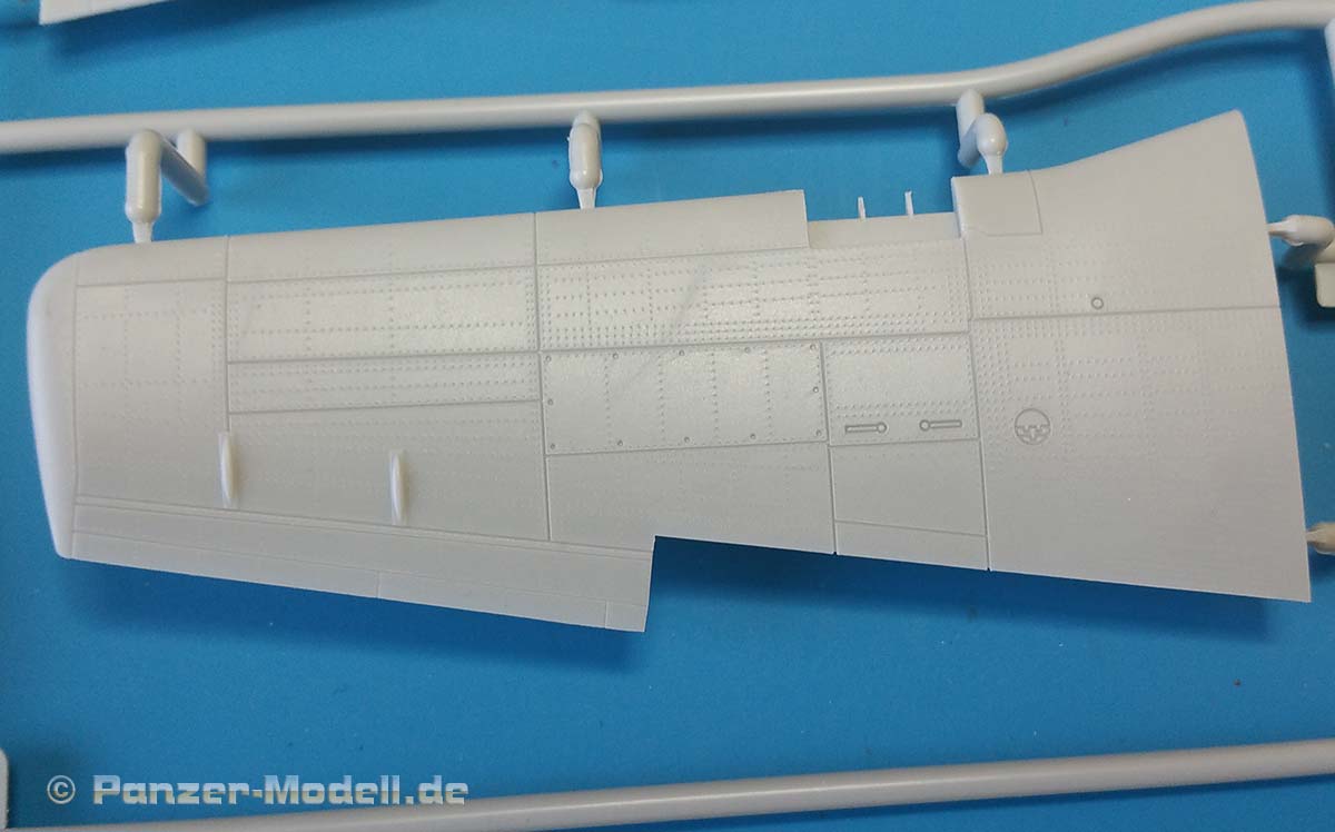 Im Allgemeinen hat der Bausatz einige ganz leicht raue Oberfläche an manchen Stellen. Die Oberflächendetails hauen mich vom Hocker. Allerfeinste Nieten reihen sich dicht an dicht auf den Tragflächen, Klappen und dem Rumpf. Das ist wirklich toll gemacht und verlangt nach einem ganz feinen Farbauftrag.