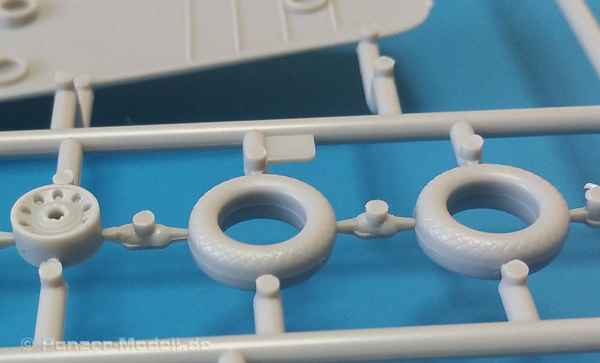 Beim Blick auf das Fahrwerk und in die Fahrwerkschächte, macht sich bei mir ein befriedigendes Lächeln breit. Selbstverständlich kann man dort noch ein bisschen nachdetailieren, tut aber nicht wirklich Not. Was mich etwas verwundert sind die Reifen. Es ist der sogenannte "Diamond Thread" als Profil drauf. Allerdings nicht auf der Lauffläche. Ob das schon eine gewisse Abnutzung darstellen soll, entzieht sich meinem Wissen. Und die Felgen hätten auch etwas knackiger von den Details her sein dürfen.