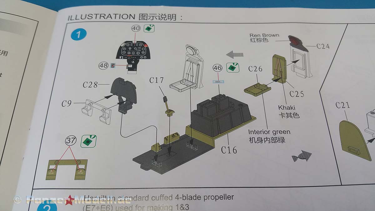 Äußerlich macht sich das durch die Funkanlage und den Propeller sichtbar. Nun hat Bronco zwei verschiedene Hamilton Propeller beigelegt. Das ist für die D Version schon richtig und notwendig, allerdings hatte die K Version einen Propeller von der Firma Aeroproducts. Der fehlt hier völlig. Da der letztgenannte allerdings öfter rumgezickt hat, wurden viele K Versionen auf die alten Propeller zurückgebaut.