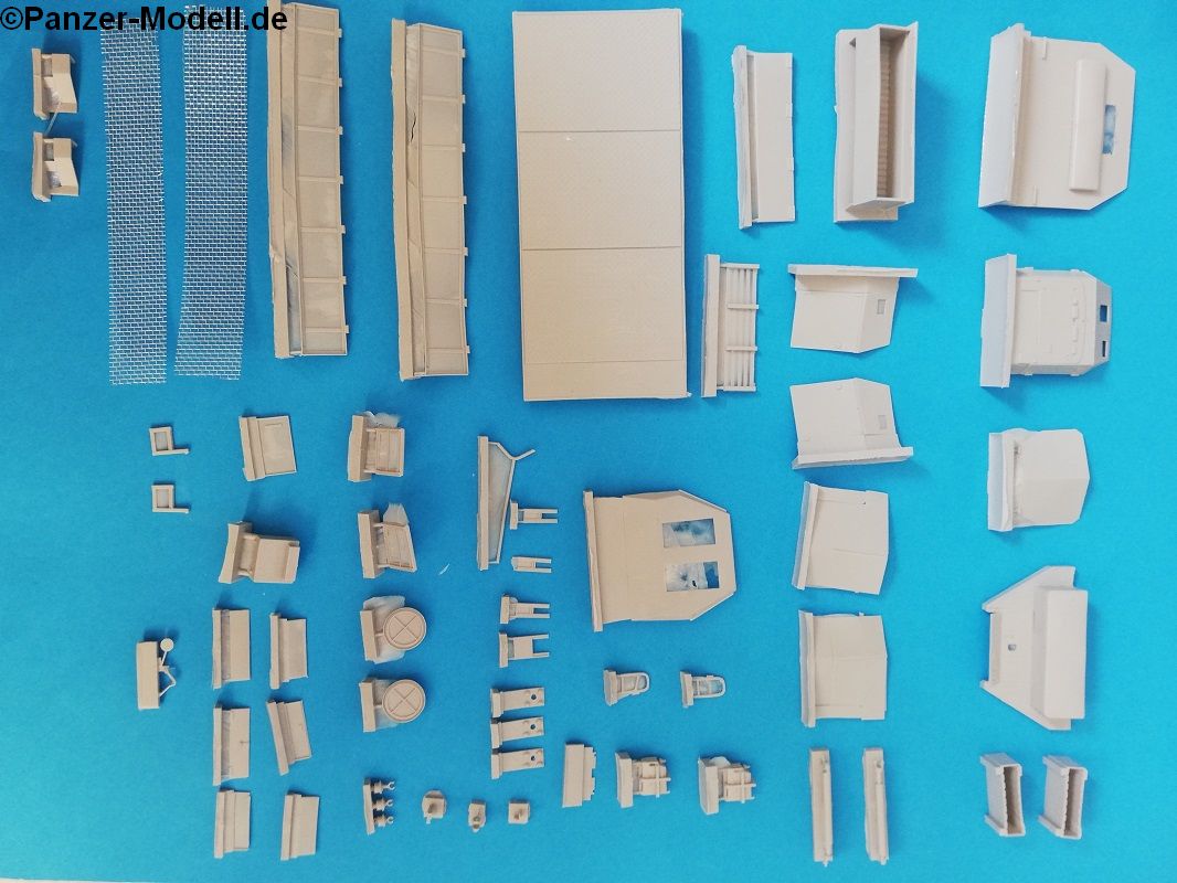 Die Typenvielfalt bei deutschen LKW macht offenbar den Herstellern von Umbausätzen eine große Freude. Der sehr rührige Berliner Kleinserienanbieter Custom-Scale nutzt diese Chance für ein eher selten fotografiertes Fahrzeug. Der Büssing NAG 4500 war als schwerer LKW bei den Wehrmachtsteilen mit fast 15.000 Fahrzeugen durchaus weit verbreitet. Eine gepanzerte Version ist aber eine ungewöhnliche Ausführung. Wie dies nun im Modell gelungen ist, werden wir uns nun anschauen. Der Bausatz wird in einem festen Karton ausgeliefert. Die Resinteile sind in mehreren Tütchen verpackt, gut geschützt durch Blisterelemente. Ein Drahtgeflecht für die Seitenwände ist im Bausatz enthalten. Eine Fahrzeugkennzeichnung dagegen nicht. Auf fünf s/w DinA4 Seiten wird durch den Zusammenbau geführt, wobei hier klar zwischen den Arbeitsschritten des Basisbausatzes und der Resinteile getrennt wird. Eine Liste der Einzelteile führt die Bauanleitung an. Das Fahrwerk wird zunächst dem AFV35270 entnommen. Die gepanzerte Kabine aus Resinteilen wird mit Details des Spritzgussmodells ergänzt. Die Ladeplattform nebst Seitenwänden und Munitionskiste ist gemäß Bauplan zu bauen. Danach sind rund um das Fahrzeug diverse Anbauteil speziell für die gepanzerte Ausführung zu montieren. Auf der Ladeplattform wird dann die gewünschte Flak entweder eine 2cm Flak 38 Vierling oder die 3,7cm Flak 37 (die nicht im Bausatz enthalten sind) - befestigt. Hierfür gibt es passende Führungsschuhe. Wie sehen nun die Bauteile aus? Die ausschließlich aus Resinteilen bestehende Fahrerkabine wird aus acht großflächigen Elementen zusammengebaut. Dabei helfen die auf der Innenseite befindlichen Führungen. An diesen Resinteilen sind sowohl innen als auch außen sehr schön die Nieten und Winkel dargestellt. Der Boden der Fahrerkabine zeigt ebenfalls feine Details. Ergänzt wird der Innenraum durch die Bauteile des Basisbausatzes z.B. Instrumententafel oder Lenkrad. Dieser erste gute Eindruck wird durch einen leichten Verzug der Kabinenteile geschmälert. Für den geübten Modellbauer ist dies jedoch kein Problem, da im heißen Wasserbad oder durch einen Fön die Teile in Form zu „wärmen“ sind. Die Angüsse der oben beschriebenen Bauteile sind einfach zu entfernen. Die Kanten müssen jedoch noch versäubert werden. Gleiches gilt für das auffällige Frontblech. Insgesamt feine Details mit leichtem Verzug. Etwas irritierend ist jedoch der starke Verzug der Seitenwände. Aber keine Sorge, dass geht wieder mit Hitze zu richten (am besten heißes Wasser), schick ist jedoch anders. Die vielen kleineren Bauteile sind alle fein gegossen und sind gut vom Anguss zu trennen. Den benötigte Basisbausatz bekommt man von AFV mit der Nummer AFV35270 und ist aktuell im Handel verfügbar. Decals sind nicht enthalten. Ein interessanter Bausatz, der jedoch durch das Richten der Bauteile für einen Anfänger schnell die Freude an Umbausätzen trüben kann. Wenn diese Hürde genommen ist, dann erhält man mit diesem Modell einen weiteren Hingucker aus dem Hause Custom-Scale.