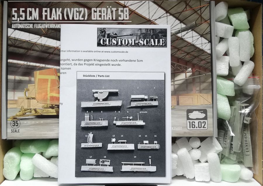 Der Kleinserienhersteller Customscale überrascht uns immer wieder mit seltenen bzw. wenig bekannten Fahrzeugen oder Geschützen. Und so ist es wenig überraschend, dass dann doch überraschend ein Flugabwehrgeschütz präsentiert wird, zu dem Google überraschend wenig zum Lesen bietet. In einem US-Geheimdienstbericht sind deutsche Dokumente aufgeführt, die das Gerät 214 beschreiben. Die mittlere Flak, die den Bereich der Kaliber zwischen 3,7cm und 8,8cm abdeckt, sollte mit dem Kaliber 5cm bzw. 5,5cm erweitert werden. Die 5cm Flak 41 erwies sich dabei als vielversprechend und kam auch mit nennenswerten Stückzahlen zum Einsatz. Für die Prototypen mit Kaliber 5,5cm verlief hingegen ab Mitte 1944 die Entwicklung kriegsbedingt eher zäh. Die Luftwaffe erprobte unterdessen erfolgreich die 5cm MK 214 a. Anhand dieser Erfahrung wurde die Waffe auch als Flugabwehrgeschütz in Betracht gezogen und weisungsgemäß als Schubkastenlösung fertig gemacht, wobei dafür noch die verfügbaren Lafetten des Geräts 58 vorgesehen waren. Der Bausatz wird in einem relativ großen, stabilen Karton ausgeliefert. Darin befinden sich drei Kunststofftüten mit den Resinteilen. Diese sind gut geschützt mit Verpackungschips. Im Karton ist zudem ein kompletter Bausatz des 5,5cm Flak Gerätes 58 der recht jungen Firma 16.02 enthalten. Die zweiseitige Bauanleitung s/w gibt einen kurzen geschichtlichen Hintergrund zum Geschütz, ein Übersicht der Bauteile und auf drei Bildern die bereits montierte Waffe bzw. die beiden Seiten des fertigen Modells. Zunächst zum Resinbausatz, der die eigentliche Waffe MK 214 darstellt: Die Einzelteile sind recht detailliert, konturiert gegossen und frei von Verzug. An dem filigranen Innenleben der Waffe war in meinem Bausatz teils noch Fischhaut vorhanden. Es ist kein Problem dieses hauchdünne Überschussmaterial zu entfernen. Für alle Bauteile gilt, dass die schmalen Stege zum Grußträger ebenfalls einfach zu beseitigen sind. Die Schwenkeinrichtung für die Höhe liegt als kompaktes Bauteil bei und nimmt später die Waffe auf. Der Anguss liegt etwas ungünstig am Zahnrad, was bei montiertem Geschütz nicht mehr sichtbar ist. Die feinen Nieten, die Versteifungsstreben usw. dieses Bauteils sind klar definiert. Das Waffengehäuse hat dünne Seitenwände mit feinen Nieten. Die gesamte Mechanik der Waffenabfeuerung ist sehr schön wiedergegeben. Auch der Waffendeckel hat unterwärts angedeutete Hebel, so dass insgesamt das Gerät offen dargestellt werden kann (oder besser: sollte?!). Die Mechanik des Rohrrückholers ist ebenfalls ohne Makel. Gleiches gilt für das konisch zulaufende Rohr und die Mündungsbremse mit seiner fein angedeuteten Durchbohrung. Der Basisbausatz 5,5cm Flak Gerät 58 der Firma 16.02: Die Firma 16.02 ist ein Ableger von Customscale und deckt künftig die Sparte der Spritzgussmodelle ab. Der Karton ist ansprechend mit einem farbigen Deckelbild gestaltet und zeigt auf der Rückseite drei Farbvorschläge für die 5,5cm Flak Gerät 58. Im stabilen Klappkarton sind 5 Spritzlinge, ein Aluminiumrohr, ein Ätzteilbogen und die Bauanleitung enthalten. Alle Teile sind eigens in einer transparenten Folie verpackt. Die Bauanleitung führt auf 11 Seiten zum kompletten Modell der 5,5cm Flak wir haben hier jedoch die 5cm Flak MK 214 vorliegen und benötigen aus dem Spritzgussmodell ausschließlich die Teile der Lafette. Die Bauteile für die Unterlafette haben feine Angüsse, die später nicht mehr sichtbar sind. Die Wahl zwischen Transport- oder Feuerstellung ist auf fünf Bildern beschrieben. Hierbei werden drei Arme der Niveauregulierung behandelt. Diese kleinen Bauteile lassen sich wohl gut vom Gussast trennen und haben feine Details. Die Montage dieser Arme bestehend aus Zylinder, Kolbenstange, zwei Führungsstangen und Fuß wird sicherlich ein besonderes Thema eines Bauberichtes sein so zumindest der erste Eindruck. Die Hilfestellung zur Positionierung der Teile mittels Pfeilen ist dabei sehr sinnvoll. Die Baustufen 3 bis 6 behandeln die 5,5cm Flak. Die Teile vermitteln alle eine schöne Detaillierung was an dieser Stelle fehlt, ist ein Hinweis der für die 5cm Flak MK 214 benötigten Bauteile. Hier ist die Verbindung zur Bauleitung des Resinbausatzes herzustellen. Ein Blick auf die sicher zu verwendenden Teile wie beispielsweise die Seitenlafetten, Laufsteg, Optik oder Höhenrichteinrichtung überzeugt durch die gute Qualität. Dies mache ich an der feinen Ausführung der Stellräder oder Nieten fest. Die Anzeigen zur Höhen- und Seitenrichtung, die Sitze und Handräder im Bauschritt 7 + 8 machen auch Freude. Die letzten Schritte behandeln die von Nieten überzogenen Segmente des Schutzschildes. Die Angüsse sind kein Thema und von Auswerfermarken keine Spur. Ergänzt werden die Schildteile durch Halterungen, Stangen und durch die Pedale der Abfeuerung. Das Aluminiumrohr und den Ätzteilbogen habe ich nicht unterschlagen, sondern diese werden schlicht nicht für die MK 214 benötigt. Im Bauabschnitt 10 wird genau ein Teil beschrieben. Hier ist eine Kleinigkeit anzumerken, da das Bauteil jener Ring ist, der die Seitendrehung der Flak führt. Darüber sollte sich der Modellbauer früher Gedanken machen. Wie dies gelöst werden kann, ist dem Baubericht via folgendem Link zu entnehmen: http://www.panzer-modell.de/berichte/55mm_flak/55mm_flak.php Stichwort Nachhaltigkeit: Customscale verpackt die Artikel mit Biochips aus Mais. Fazit: Das Team um Customscale traut sich was. Und recherchiert offenbar unermüdlich. Denn sonst treten solche Spezialitäten nicht zu Tage. Die Qualität ist gut, die Detaillierung bestens. Ein gedrehtes Rohr wäre schön. Irgendein Haar muss doch zu finden sein. Im Ernst. Ein beeindruckendes Flugabwehrgeschütz, das sicherlich einen ganz besonderen Platz in der Sammlung erhält. Meine Empfehlung. Keine Überraschung. Vielen Dank an Michael Baldeweg für das Muster