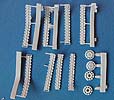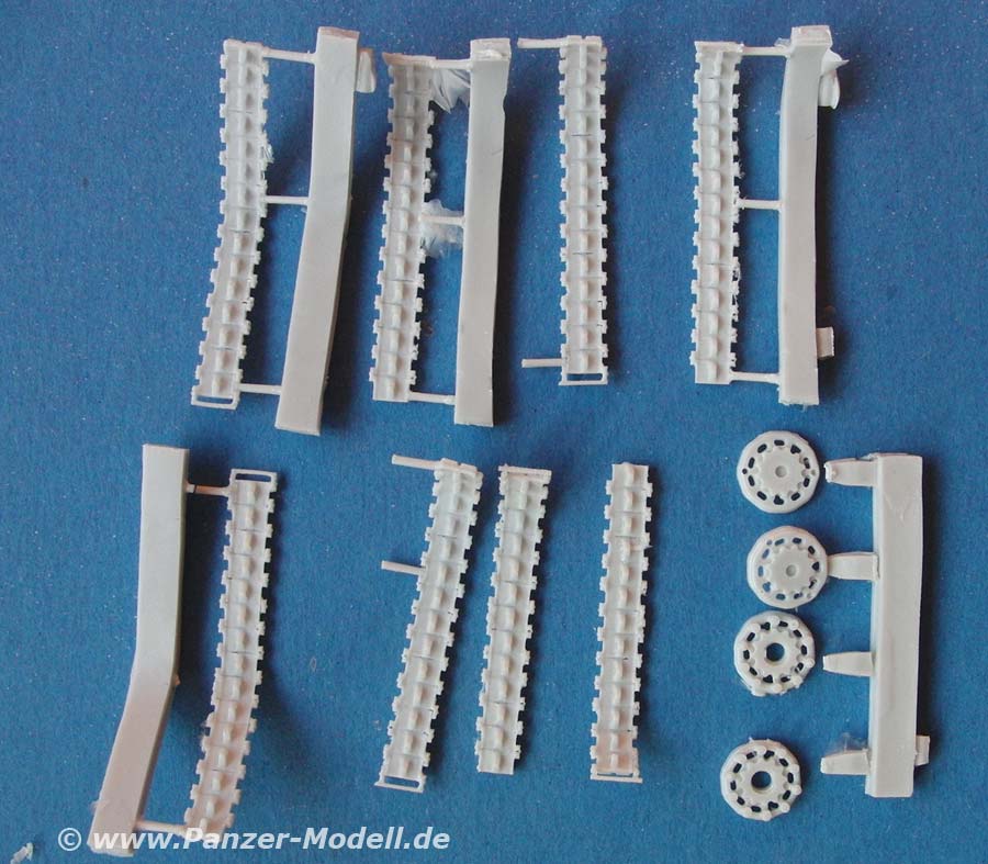 Im Set enthalten sind 12 Resinteile zum Bau der korrekten, aktuellen Stahlkette für die Wiesel 1. Dies umfasst 4 Segmente der Kette pro Seite und die neuen Treibräder, die sich aus zwei halbteilen zusammensetzen.