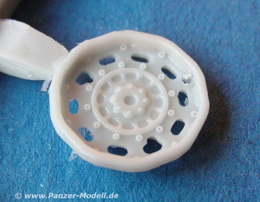 Der Guss der Treibräder ist hervorragend mit den feinen Durchbrüchen und der kantigen Struktur. Wie gesagt - es handelt sich hier um die neuen Treibräder die zu der neuen Kette gehören und damit die "falschen" aus dem bausatz ersetzen.