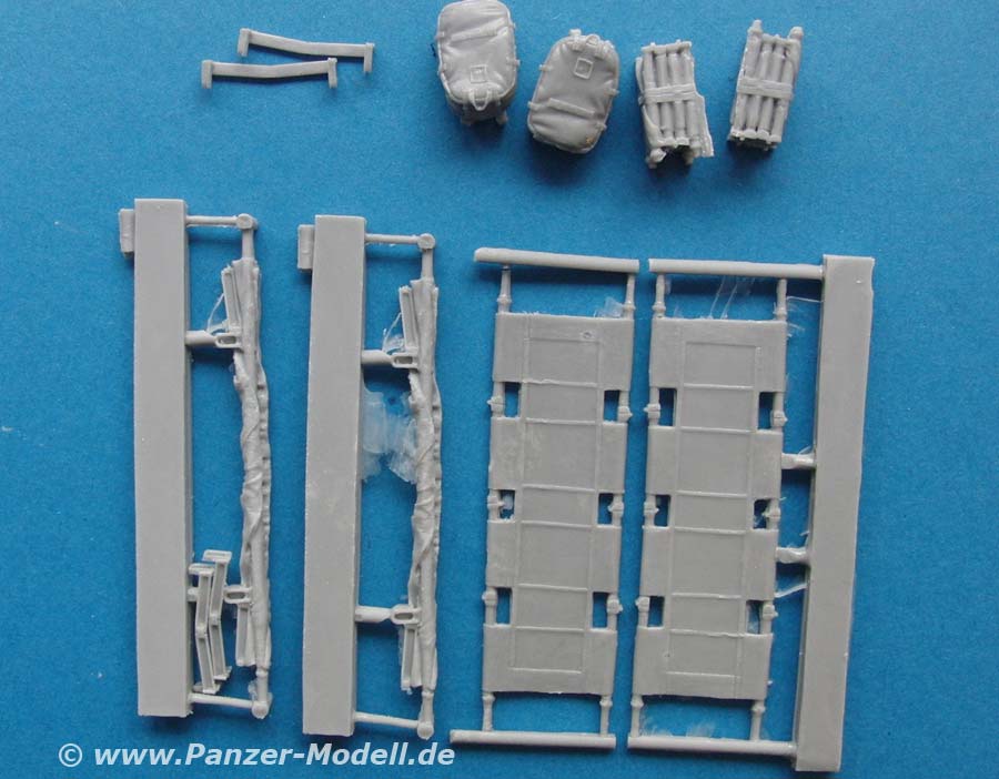 Im Set enthalten sind 2 Resinteile zum Bau von vier militärischen Tragen mit medizinischen Taschen. Als Ergänzung liegen fein detaillierte Taschen bei, die mit Riemen, verschlüssen und dem faltenwurf richtig zu gefallen wissen. Ein sehr schönes Set für rund 9 Euro, das Dioramen oder auch Einzelfahrzeuge mit passendem Zusatzmaterial ausstattet..