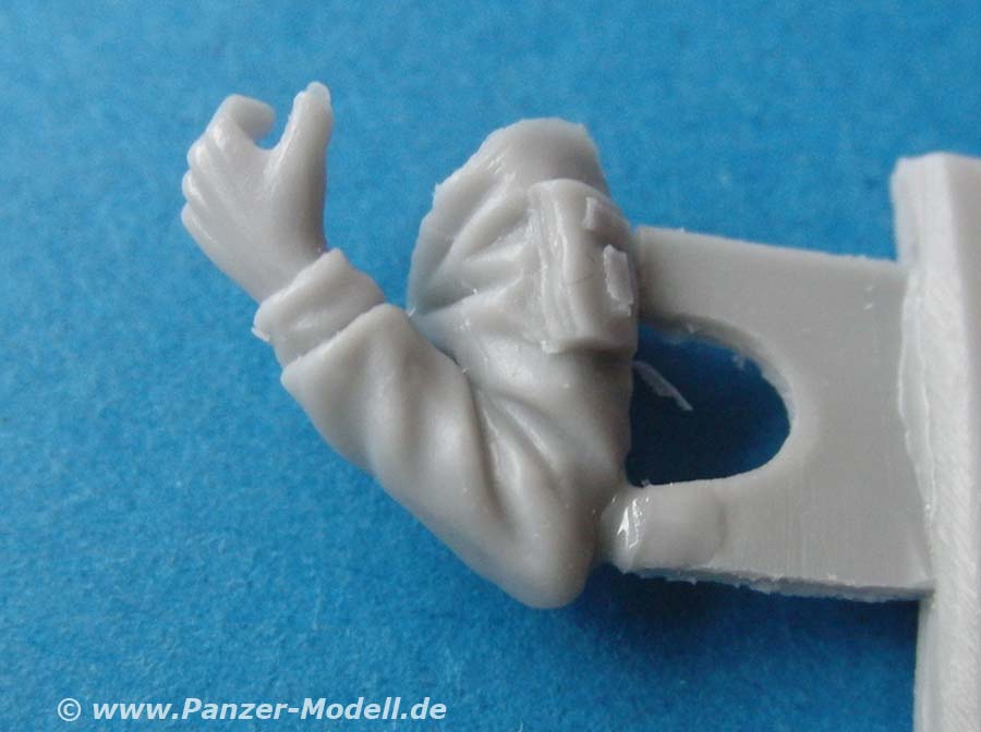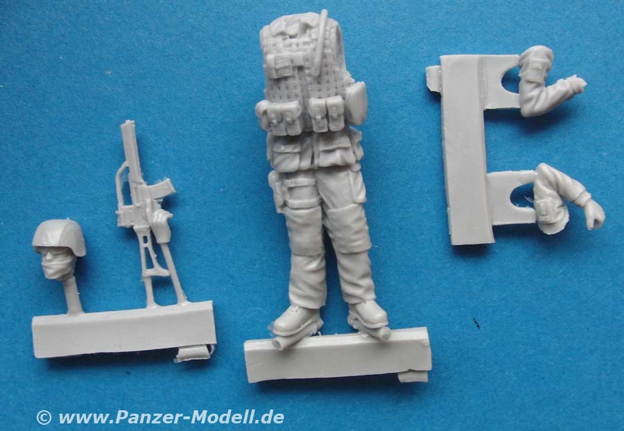 Die Figur ist in gewohnter Manier mit dem Körper in eine Stück gegossen. Hier müssen nur noch der Kopf und die Arme angeklebt, sowie das Gewehr angebracht werden. Als Pose ist die Figur stehend, mit dem Gewehr ein wenig in lockerer Rambo Haltung.
