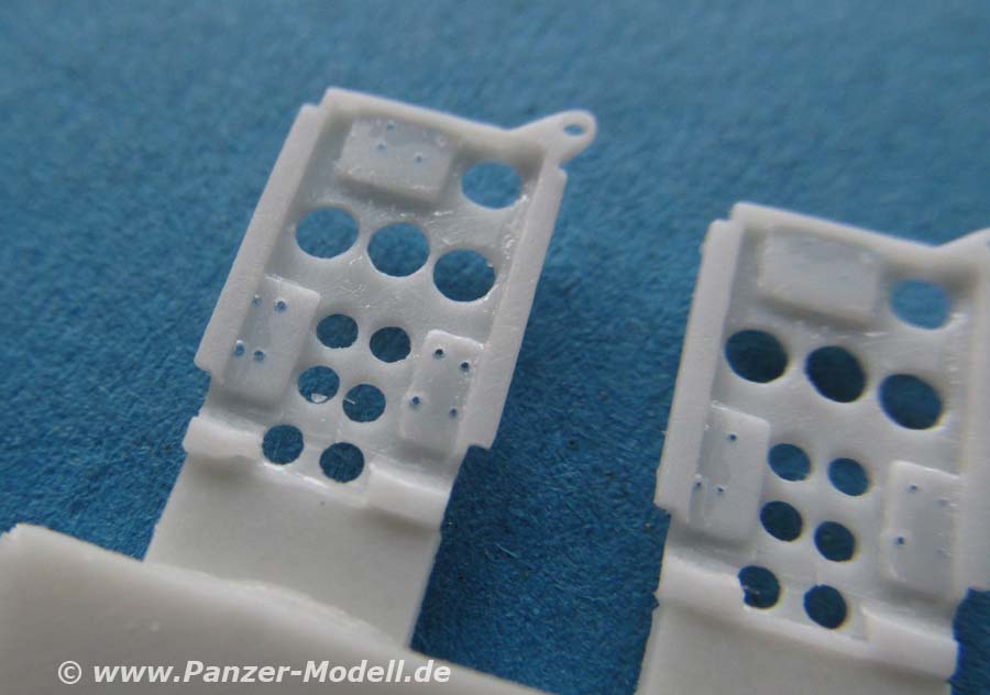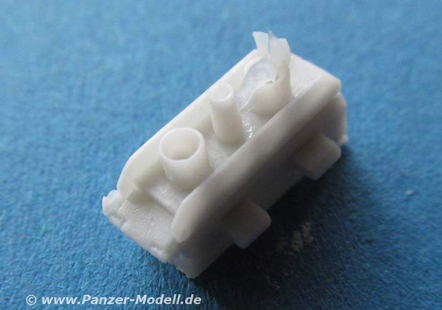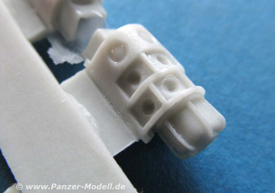 Die Teile bauen sich zu den entsprechenden Zusatzinstallationen an den Turmseiten und am Kanonenrohr, die gemacht wurden um bei Übungen Abschüsse zu simulieren. Die Detaillierung und Feinheit der Gussteile ist wirklich ausgesprochen gut und die Angüsse sind angenehm klein und leicht zu versäubern.