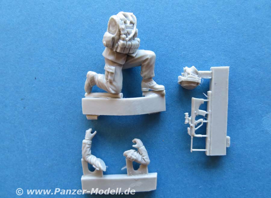 Die Figur ist relativ komplett in einem Stück gegossen. Lediglich die beiden Arme und der Kopf sind einzeln und müssen vom Modellbauer angeklebt werden. Wobei das einzeln beiliegende gewehr am ende natürlich auch noch separat angeklebt werden muss.