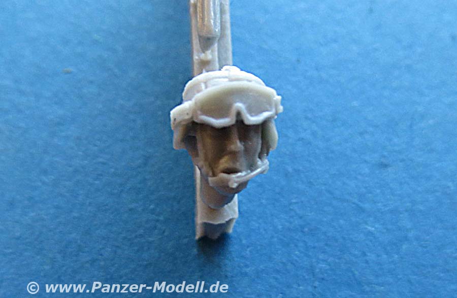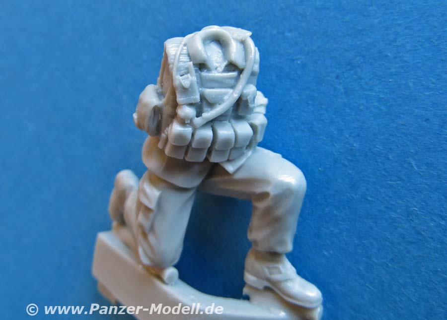 Die Details der Uniform, Kampfstiefel und Ausrüstung sind sehr schön heausgearbeitet mit realistischem Faltenwurf und Details. Der Kopf ist mit Gefechtshelm und Staubschutzbrille versehen und sieht richtig gut aus.
