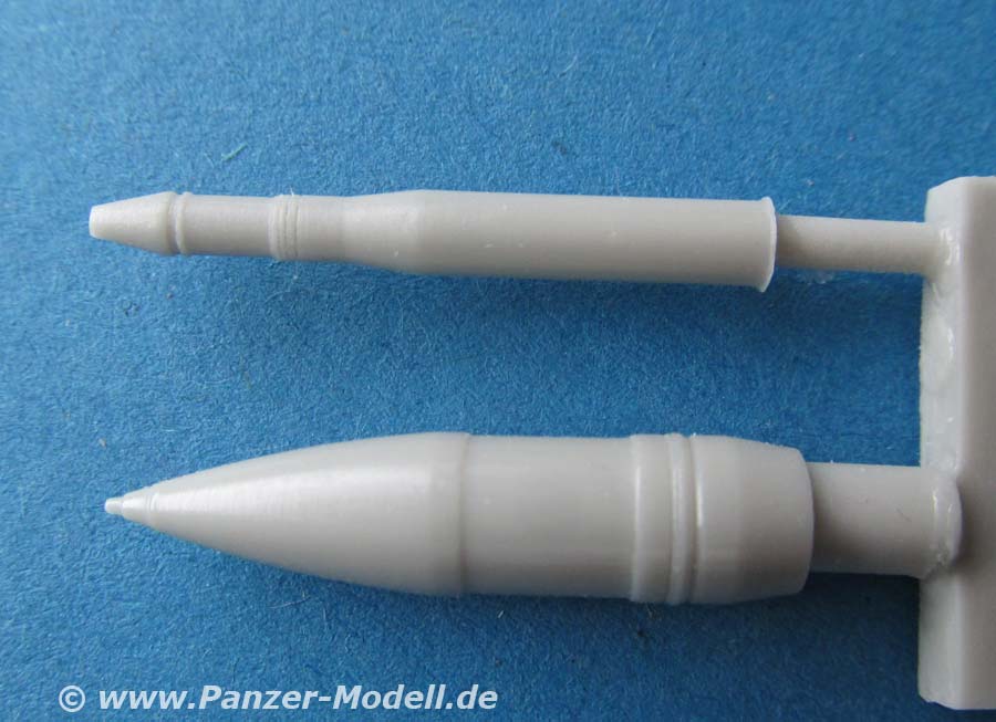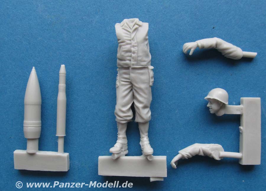 Dem Set liegen eine Panzergranate mit Hülse und eine Artilleriegranate bei, von denen man eine in die Hände der Figur legen kann.