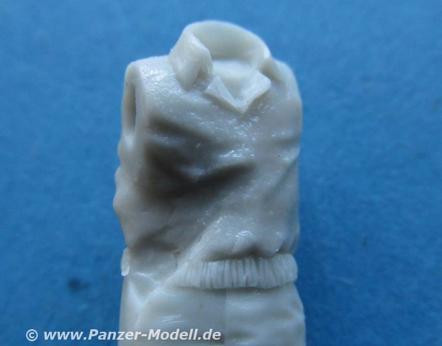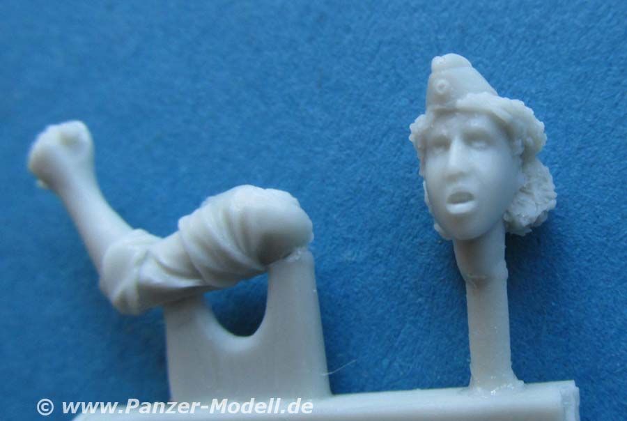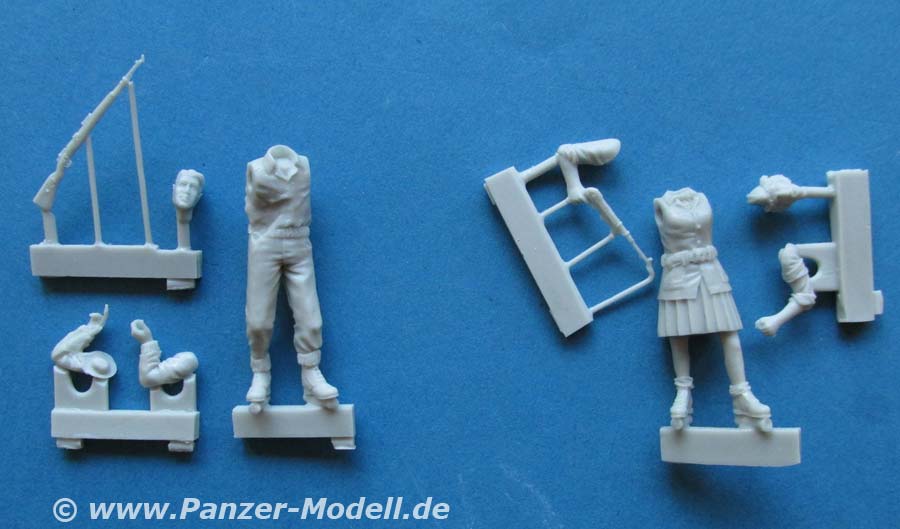 Die Figuren sind jeweil bereits nahezu komplett in einem Stück gegossen. Lediglich der Kopf, beide Arme und im Fall der männlichen Figur auch das Gewehr müssen einzeln angeklebt werden.
