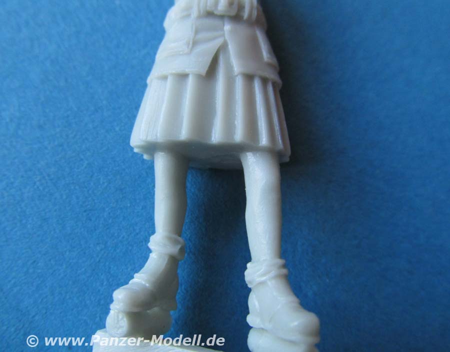 Die Details der Kleidung sind schön heausgearbeitet mit realistischem Faltenwurf und netten Details. Dies gilt für beide Figuren - auch wenn man in extremer Nahbetrachtung das Gefühl hat die Formgebung der Details ist etwas weich. Da könnte noch etwas Luft nach oben sein. Der Rock der Frau ist mir eine Idee zu steif und am unteren Ende komplett voll ausgegossen mit keinerlei Hinterschneidung - bei einem niedrigen betrachtungsstandpunkt, kann man das leider sehen.