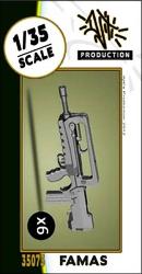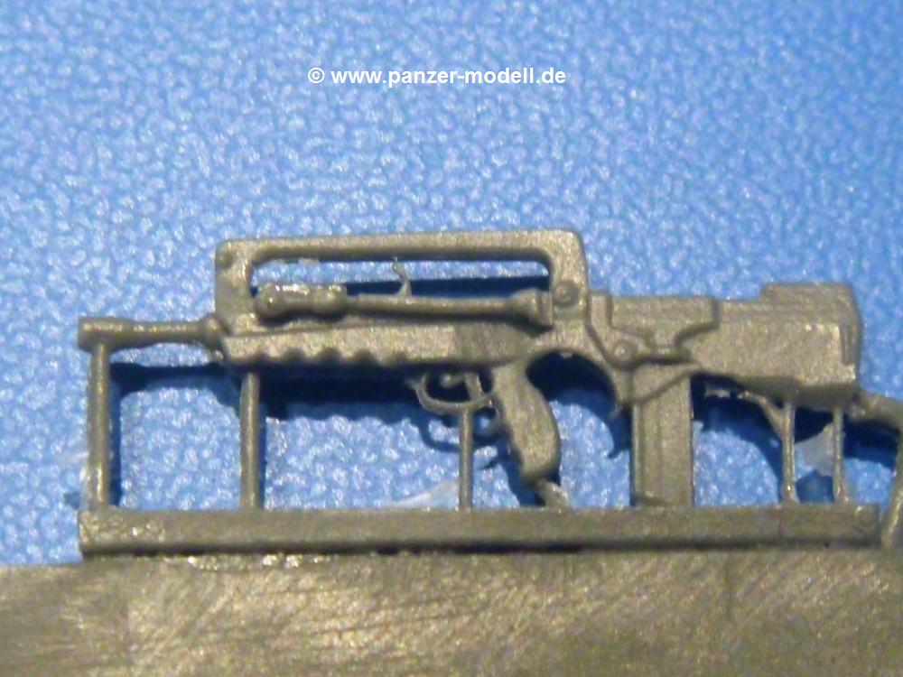 Im Set 35073 sind 6 sehr schöne Sturmgewehre des Typs FAMAS F1 enthalten. Tragegriff, angeklapptes Zweibein, Abzugs- und Sicherungshebel, Magazin, Schulterstütze und Lauf hat sehr gut detailliert. Die beim Original vorhandenen "Ecken" in der Handstütze sind etwas zu "weich" wiedergegeben, aber immer noch erkennbar. Alle Teile sind blasenfrei und die Angüsse sind sehr fein. Trotzdem sollte man besonders beim Lauf und dem Abzugsbügel Vorsicht walten lassen, wenn man die Angüsse abtrennt. Fischhäute sucht man vergeblich. Es gibt so gut wie keinen Grat. Ein gelungenes Waffenset, mit dem man moderne französische Soldaten und Fahrzeuge ausstatten kann.