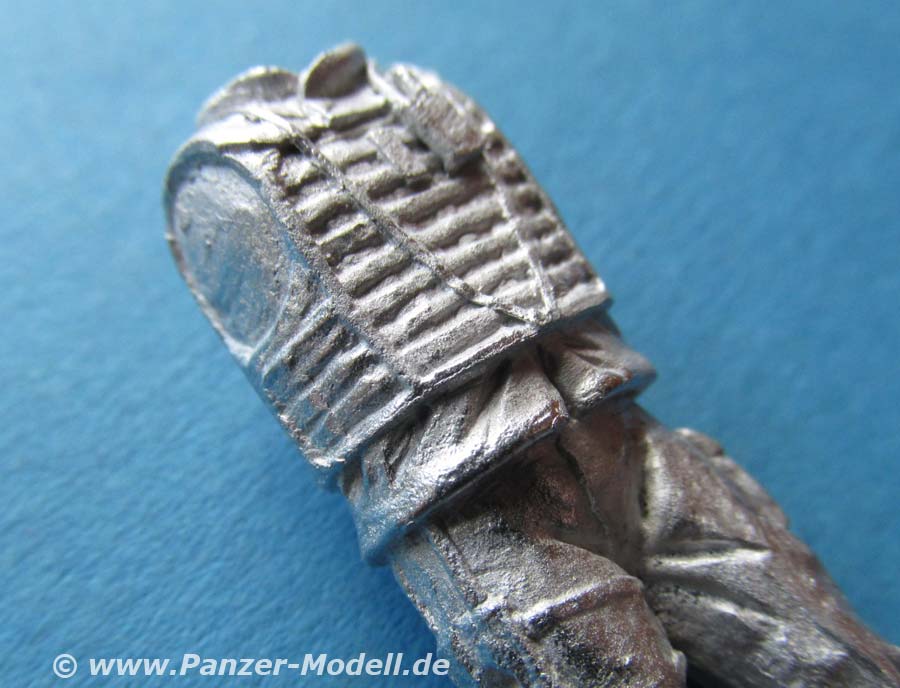 Der Kopf ist mit dem aktuell neuesten Helm der Bundeswehr ausgestattet mit anderer Form, leichter und mit eingebauter Halterung für Nachtsichtgeräte - die Details des Gesichts mit der Mimik und die Gestaltung der Kopfbedeckung sind für Metallguss wirklich gut gemacht. Es liegt in der Natur des Metallgusses, dass bei extremer Nahbetrachtung die Oberfläche rauh und unsauber aussieht.