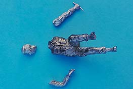 Das linke Bein fest am Boden ist Stütze für den leicht nach links gebeugten Oberkörper, der damit der öffnenden Tür ausweicht. Der rechte Fuß ist etwas angehoben und balanciert den Körper aus. Die rechte Hand hält dabei den - bereits angegossenen - Griff fest umschlossen. Somit ist die Figur primär für höher liegende Türen geeignet. Der Faltenwurf an Jacke und Ärmel gibt sehr schön die korrekte Position des rechten Arms vor. Der linke Arm hängt locker am Körper liegend herunter. Die gesamte Ausführung der Details, wie Knopfleiste, Barett, aufgesetzte Taschen bis hin zum Gesicht haben eine feine Ausprägung und sind somit eine gute Basis für die spätere Bemalung.