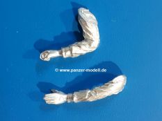 Um die neueren MAN KAT 1 Modelle von Hobby Boss etwas zu beleben, liefert uns Dolp ein ganze Reihe Bundeswehr Soldaten. Einen davon haben wir vor uns. Die Figur besteht aus dem Körper, Kopf und separaten Armen und kniet mit dem rechten Bein auf dem Sitz in der offenen Beifahrertür, stützt sich mit der linken Hand am Rahmen ab, während er mit der rechten die Handkurbel der Reserveradwinde bedient. Er trägt Kampfstiefel an den Füßen, eine Schirmmütze auf dem Kopf und den, für den technischen Dienst typischen, „Blaumann“ (Overall in blau). Der Blaumann kann ob seiner Natur nicht mit vielen Details glänzen. Er besitzt nur eine linke Brusttasche. Vorn überdeckt eine Knopfleiste die Knöpfe. Das Hüftband ist etwas eingezogen, so dass sich der typische Faltenwurf zeigt. Die Oberfläche der Teile weist eine leicht raue Struktur auf, die Metallguss so eigen ist, aber nach Bemalung wird das nicht mehr auffallen. Der Faltenwurf und die Oberflächendetails sind recht schön, wenn auch stellenweise etwas weich. Details wie das Gesicht und die Stiefelsohlen sind gut gestaltet. Zu der Figur gehört eine Kettenwinde, eine Handkurbel, ein Stück feine Kette und ein Bolzen. Die Winde besteht aus dem Gehäuse, einer Spiralfeder und der Kurbelstange bis zum Fahrerhaus. Die Kette ist lang genug für ein halb heruntergelassenes Reserverad, welches im Hinblick auf eine weitere Figur von Dolp genau richtig ist. Die Bedeutung des Bolzens ist mir unbekannt. Ich kann nur vermuten, dass er seinen Platz an der Reserveradhalterung findet und das andere Ende der Kette aufnimmt. Hier hätte ich Unterstützung von Dolp in Form eines Anbringungshinweises erwartet. Die Figur und die Winde werden den BW MAN sicherlich beleben. Tolle Sache von Dolp. |