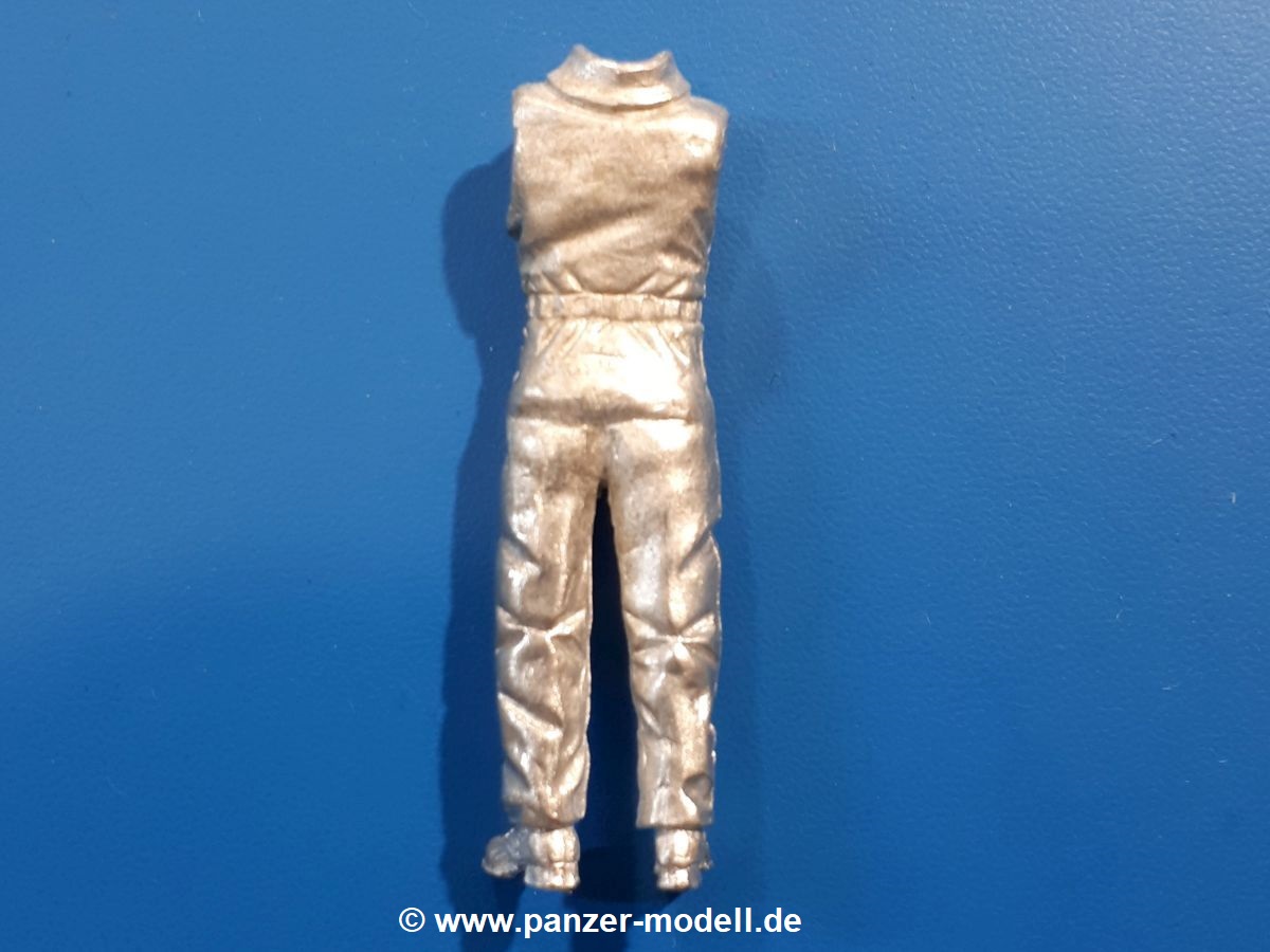 Die Figur besteht aus dem Körper, Kopf und separaten Armen und steht mit nach oben ausgestreckten Armen da, um das Reserverad des MAN KAT in Empfang zu nehmen. (Eine normale Szene, aber eher eine symbolische Geste, denn man wird das Reserverad nicht auffangen können, falls die Winde versagt oder die Kette reißt.) Er trägt Kampfstiefel an den Füßen, eine Schirmmütze auf dem Kopf und den, für den technischen Dienst typischen, „Blaumann“ (Overall in blau). Der Blaumann kann ob seiner Natur nicht mit vielen Details glänzen. Er besitzt nur eine linke Brusttasche. Vorn überdeckt eine Knopfleiste die Knöpfe. Das Hüftband ist eingezogen, so dass sich der typische Faltenwurf zeigt. Die Oberfläche der Teile weist eine leicht raue Struktur auf, die Metallguss so eigen ist, aber nach Bemalung wird das nicht mehr auffallen. Der Faltenwurf und die Oberflächendetails sind recht schön, wenn auch stellenweise etwas weich. Details wie das Gesicht und die Hände sind ansprechend geformt. Mit dieser Haltung kann man die Figur ggfs. auch anders einsetzen wie zum Hochdrücken einer Ladeklappe. Auf jeden Fall ist sie die ideale Ergänzung zu Dolp BW-167. |