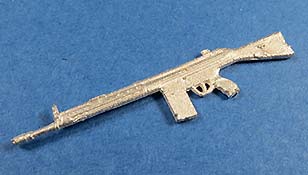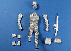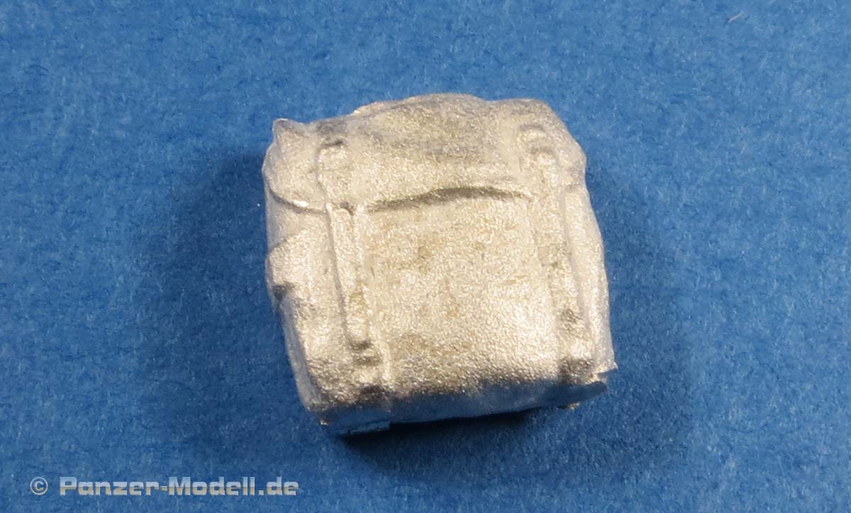 In der Packung finden wir insgesamt 11 Metallteile zum Bau einer Figur, deren Körper in eienm Stück gegissen ist und mit zwei Armen und dem Kopf vervollständigt wird. Dazu gibt es die typischen Anhängsel wie ABC Schutztasche, kleine Kampftasche, Magazintaschen, Klappspaten, usw. und natürlich das obligatorische G3.