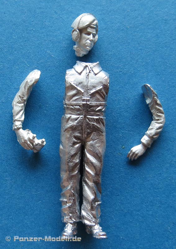 Der Faltenwurf und die Oberflächendetails der Figur wissen wie gewohnt zu gefallen und sind recht ordentlich ausgearbeitet, wennauch metallgusstypisch stellenweise etwas soft. Auch der Metallguss wirkt bei extremer Nahbetrachtung recht rauh - aber das sollte sich mit der Bemalung und normalem Betrachtungsabstand wieder geben. Der Kopf ist wie gewohnt ganz gut dargestellt mit passenden und realistischen Gesichtszügen. Natürlich ist das Sprechgeschirr mit Kopfhörern und Mikrofon auch direkt mit angegossen. Als Kopfbedeckung wird ein entsprechend gut gestaltetes Barett getragen. Das Set kostet rund 9 Euro und bietet eine nette Figur um dem Fahrzeug ein wenig Leben einzuhauchen. |