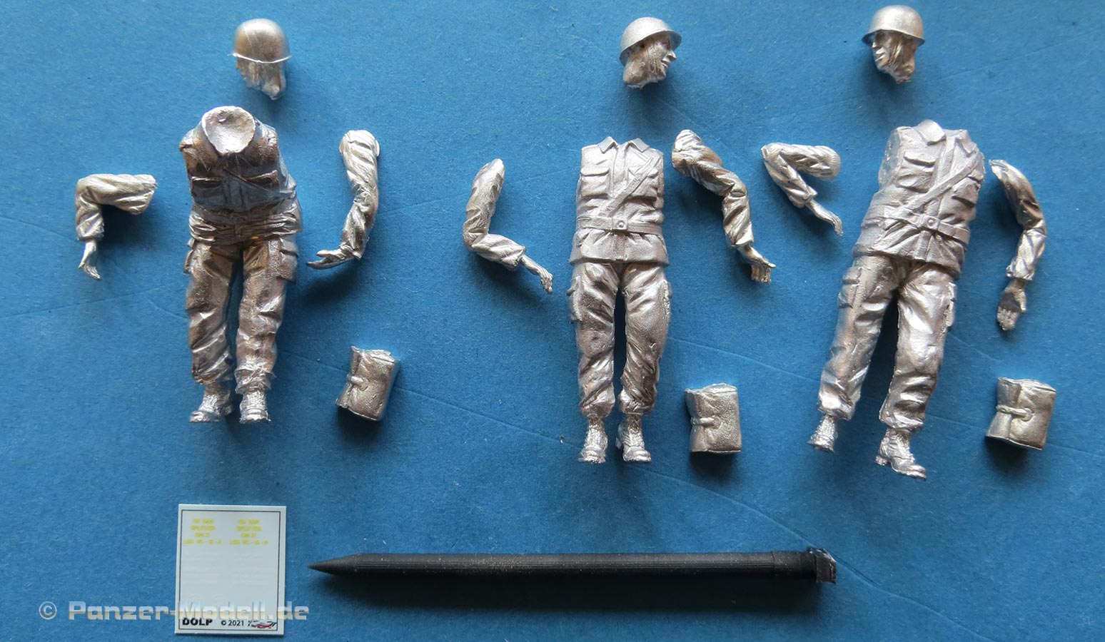Für den LKW 7t mil gl LARS 2 bietet Dolp nun einen Bausatz einer dreiköpfigen Besatzung, die den Werfer vom Boden aus mit einer Rakete belädt. Der Faltenwurf und die Oberflächendetails der Figuren wissen wie gewohnt zu gefallen und sind recht ordentlich ausgearbeitet, wennauch metallgusstypisch stellenweise etwas soft in der Detaillierung. Auch wirkt der Metallguss bei extremer Nahbetrachtung recht rauh - aber das sollte sich mit der Bemalung und normalem Betrachtungsabstand wieder geben. Die Köpfe sind wie gewohnt schön dargestellt mit passenden und realistischen Gesichtszügen soweit in Metallguss eben möglich. Als Kopfbedeckung wird der typische Stahlhelm getragen. Das Set kostet rund 30 Euro und bietet schöne Figuren und Zubehör um einer Ladeszene ein wenig Leben einzuhauchen. |