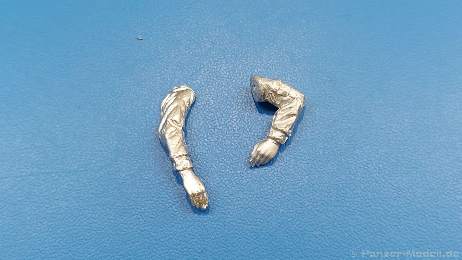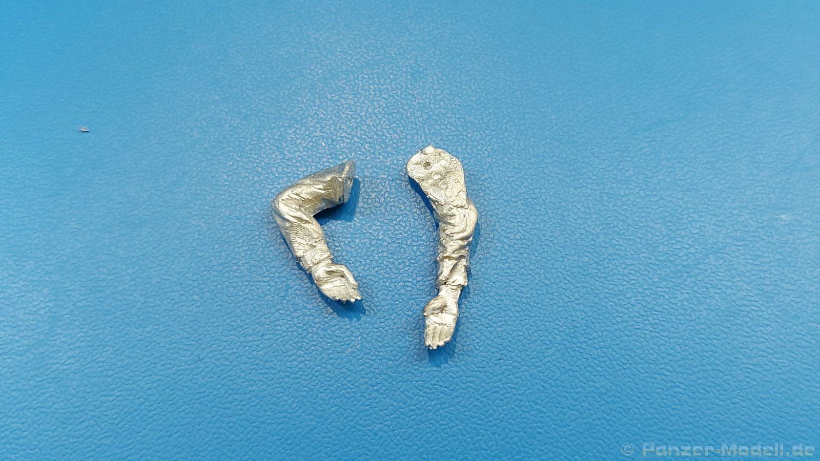 DOLP hat eine ganze Serie von Bundeswehrsoldaten passend für den TPz. 1 Fuchs von Revell herausgebracht. Da die Figuren moderne Ausrüstung in Form von Bristol Schutzwesten und -helmen tragen, empfiehlt der Hersteller, den Revell Fuchs mit entsprechenden Sets von MAD-Modellbau auf den entsprechenden Stand zu bringen. Bei seinen Figuren gibt DOLP gibt die Funktion des Soldaten im Titel vor. Dieses Mal betrachten wir die Figur des Beifahrers, der auch das MG bedient. (In unseren AUSGEPACKT werdet Ihr auch die anderen Besatzungsmitglieder finden.) Der MG-Schütze sitzt auf dem Lukenrand, mit dem linken Arm auf der Luke abgestützt, die rechte Hand am MG. Die Figur besteht aus 5 Teilen. Rumpf und Beine bilden eine Einheit. Wie bereits erwähnt trägt er eine Bristol Schutzweste mit hochstehendem Kragen, ausgebeulten Brusttaschen und einer kleinen Rückentasche. Die Hosenbeine gehen bis über die Schnürstiefel. Die Seitentaschen sind wie die Brusttaschen der Weste ausgebeult. Am linken Oberarm befindet sich eine kleine Ärmeltasche. Der Kopf ist mit Helm bereits in einem Stück gegossen. Schön zu sehen sind die Riemen des Helmes. Auch das Gesicht gefällt mir. Auf dem Helm ist die Staubschutzbrille angegossen. Auf den Fotos habe ich das fünfte Teil nicht eingefangen. Es ist der Bügel mit dem Lippenmikrofon. Aufpassen beim Öffnen des Tütchens, denn das Teil ist ziemlich klein. Insgesamt weist die Oberfläche eine leicht raue Struktur auf, die Metallguss so eigen ist, aber nach entsprechender Bemalung wird das nicht mehr auffallen. Der Faltenwurf und die Oberflächendetails sind recht schön. Hier und da findet sich feiner Gussgrat, der sich leicht entfernen lässt. Die Figur ist für ca. 9 EUR auf dem deutschen Markt erhältlich. |