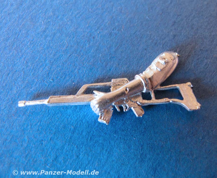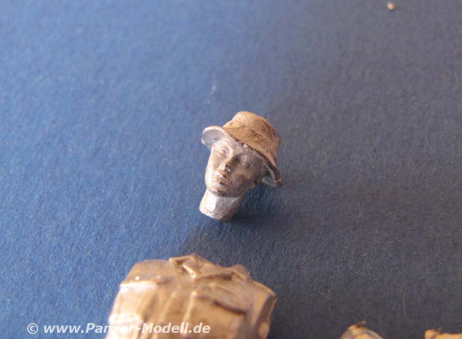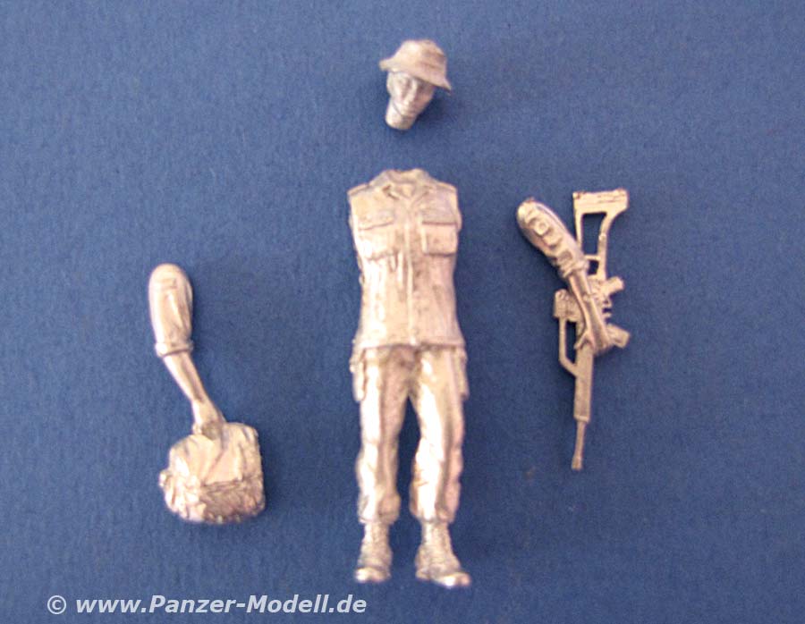 Der Kopf ist mit Buschhut versehen, am linken Arm ist ein G36 in entspannter Haltung und an der rechten Hand eine Tasche mit angegossen.
