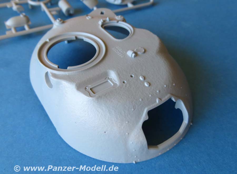 Der Turm weist wie gesagt auch eine schöne Gussstruktur auf und hat, soweit ich das sehe, alle korrekten Details der A1 Version. Die Kommandantekupel ist mit eingebautem Blenden MG, das in der Hühe beweglich bleibt, die Kuppel bleibt drehbar und der Lukendeckel lässt sich offen oder geschlossen bauen.
