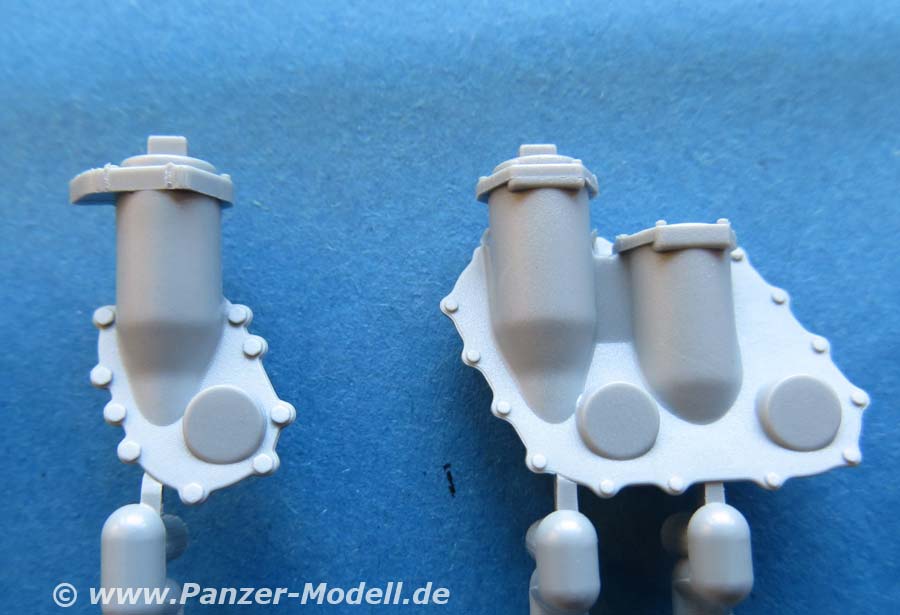 Die beiden Kettenbleche liegen einzeln bei und sind recht schön, maßstäblich dünn gemacht und die Halterungen teilweise bereits angegossen. Die restlichen Halterungen und Staukisten, sowie das Werkzeug werden einzeln angebaut - hier kommen teilweise feine PE Teile zum Einsatz.
