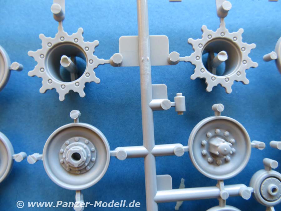 Die Laufrollen setzten sich aus zwei Halbteilen zusammen und die Laufrollengummis werden einzeln aufgesteckt. Dadurch bekommen die Laufrollen die richtgen Details mit Hinterschneidungen. Auch sonst ist die Felgenform und die Bolzen sehr schön dargestellt.