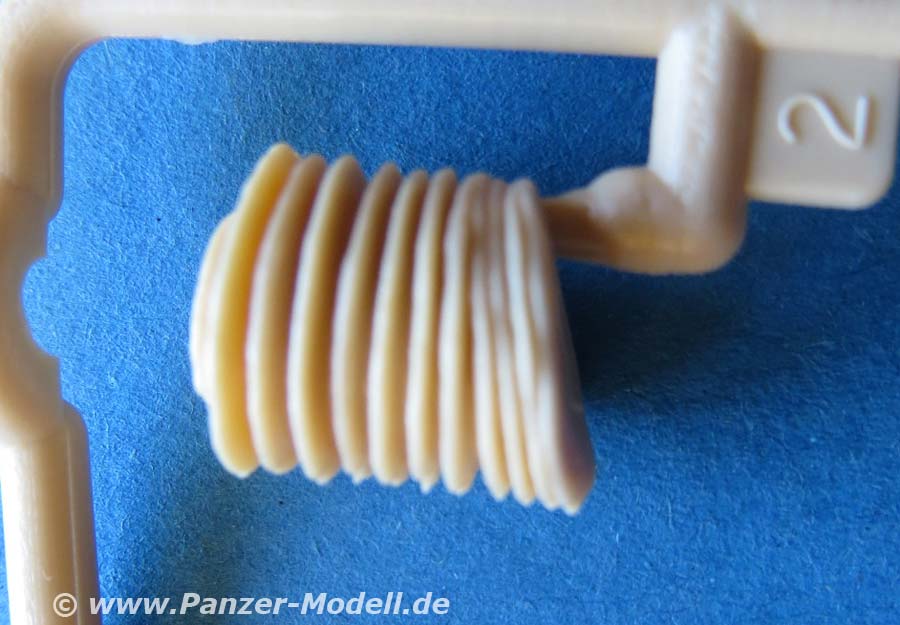 Die 90mm Bordkanone setzt sich aus dem einteiligen Hauptrohr (also keine nervigen Halbteile) und der einteiligen T-Mündungsbremse zusammen. Das Rohr liegt in zwei Versionen bei, je nachdem ob man es direkt in die nackte Kanonenblende oder in das neue Teil der Blendenabdeckplane eingebaut wird.