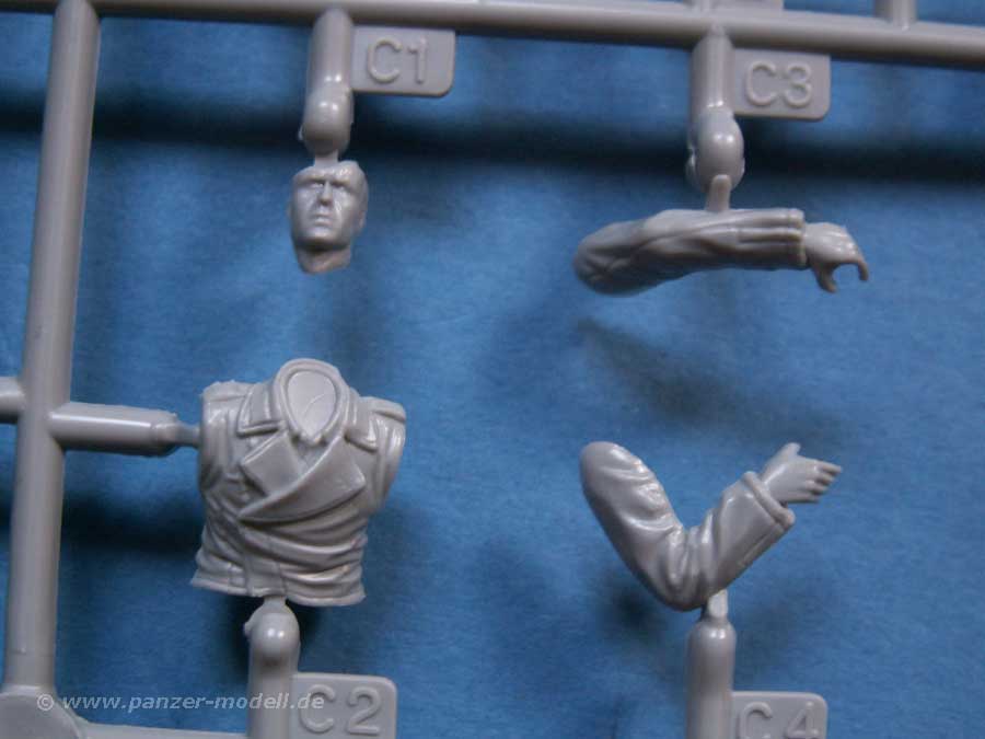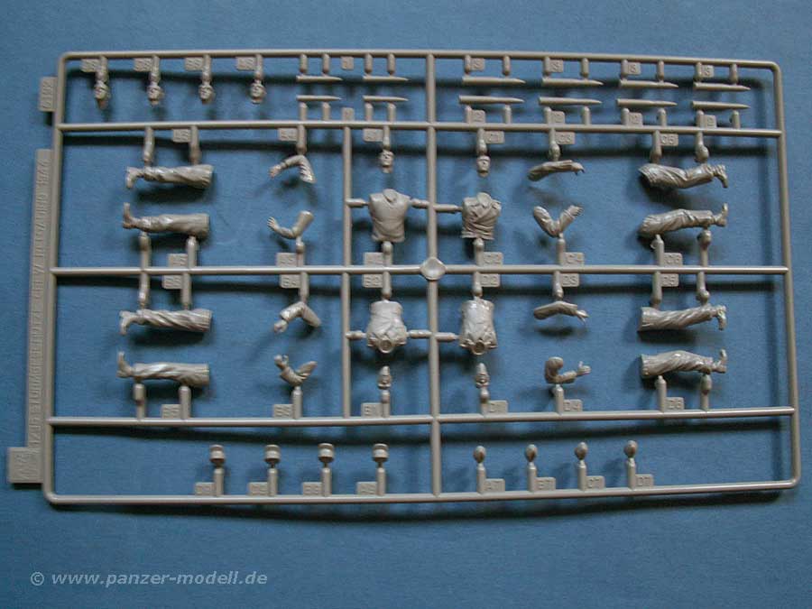 Zusätzlich ist den Figuren als Kopfbedeckung wahlweise das Schiffchen oder die Feldmütze beigegeben, sowie dementsprechende zweite Köpfe. Auserdem sind je 4 Granaten für die Stug Kanone dabei, einmal vier STück für die 7,5cm L/24 und je vier für die 7,5cm L/48 als Spreng- und Panzerbrechende Munition.