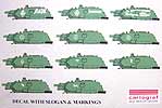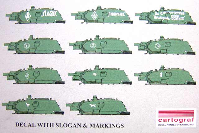 Bemalungsvorschläge gibt es zwei mit den entsprechenden Abziehbildern auf dem Decalbogen, nämlich einmal in zweifarbtarn, 21.Panzerkorps, 130.Panzerbrigade Südfront 1942 und Wintertarn mit interessanter Netzstruktur als Abziehbilder der 1.Panzerbrigade bei Moskau 1942. Dazu gibt es einen zusätzlichen Decalbogen mit 11 weiteren Markierungsdecals, auf die aber nicht weiter eingegangen wird welcher Einheit diese gehören.