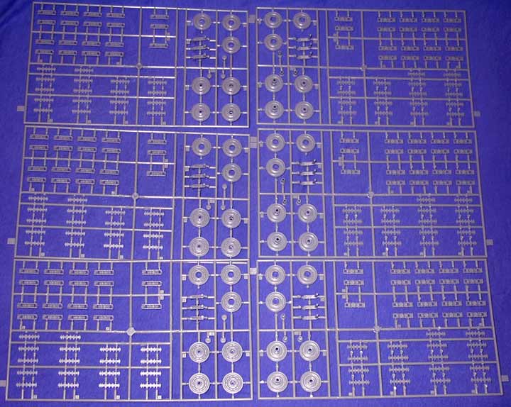 Die Qualität der Teile ist durchweg als gut zu bezeichnen und im Vergleich zu dem Tamiya Bausatz etwas feiner und detailierter. Großer Pluspunkt im Vergleich ist die hier enthaltene Einzelgliedkette, die im Gegensatz zur Vinylkette eine bessere Optik und längere Lebensdauer verspricht. Allerdings ist gerade im Bereich der Kettenglieder auch gleich ein Bemängelungspunkt, nämlich Auswerferstellen auf jedem einzelnen Kettenglied.